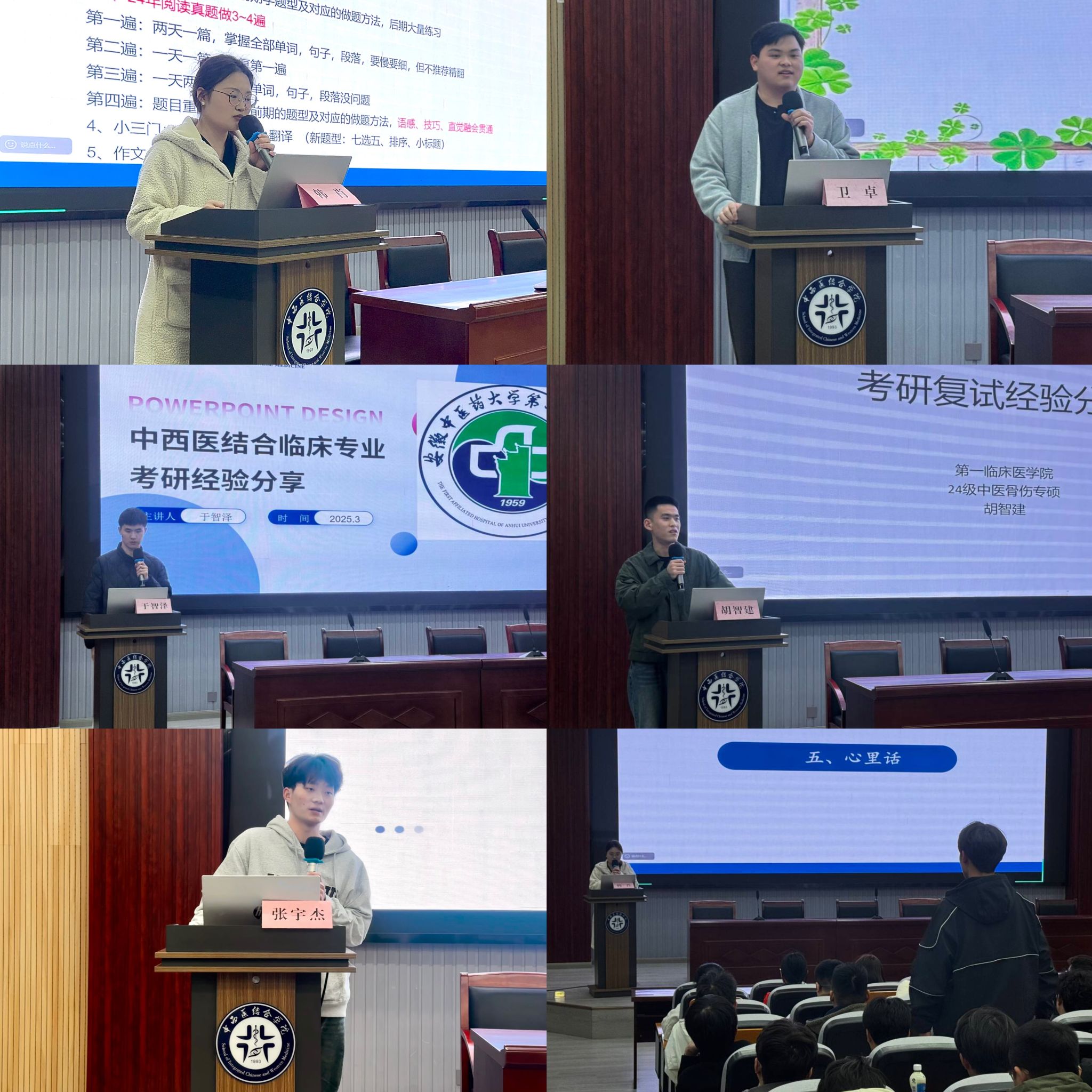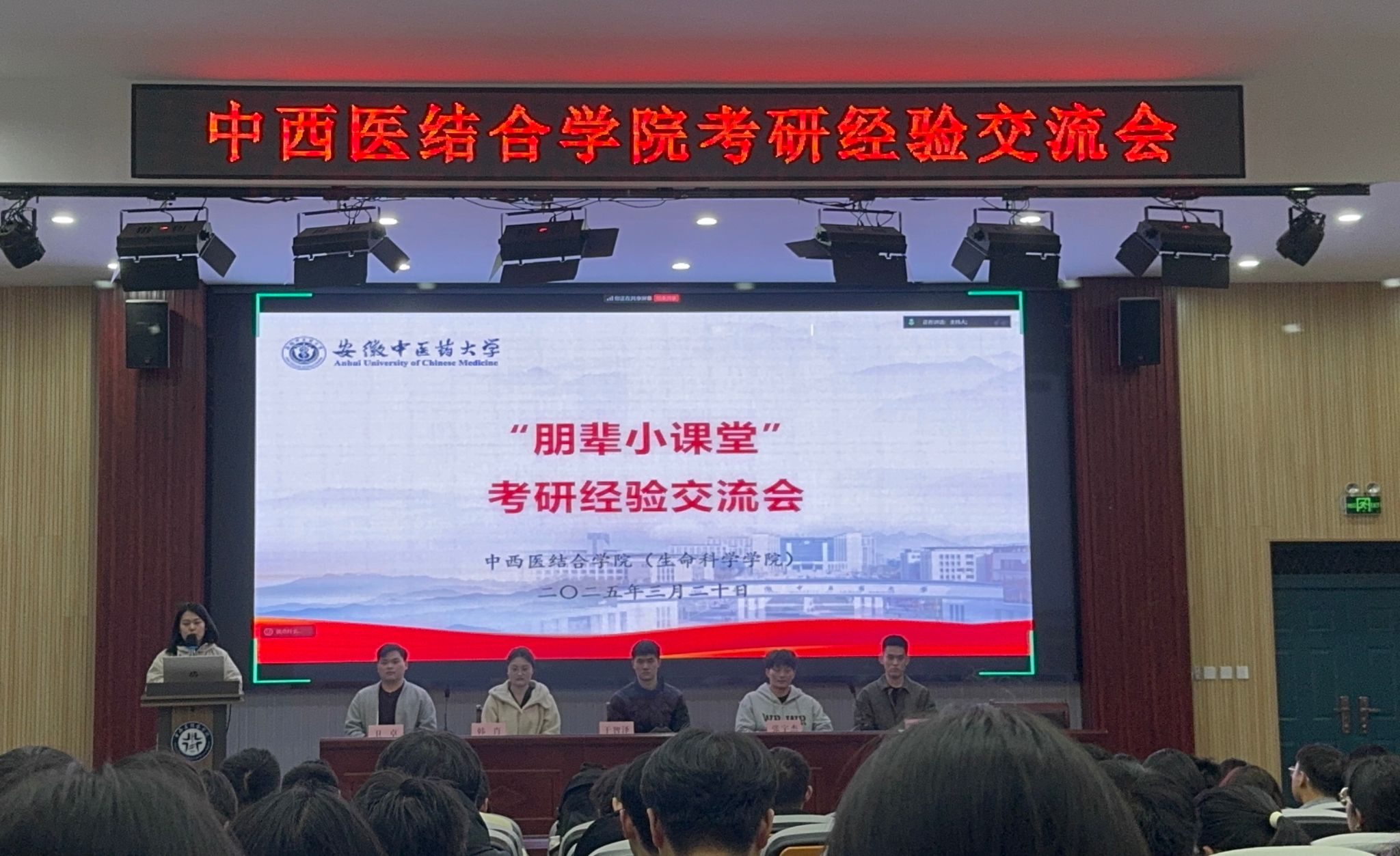 3月20日晚,中西医结合学院举办“朋辈小课堂”之考研经验分享交流会。此次活动采用线上线下相结合的方式,为意向考研学子搭建了与成功上岸学长学姐们交流互动的平台,旨在助力同学们深入了解考研形势,掌握实用高效的备考策略。本次活动特别邀请到学院2024届毕业生代表韩肖、卫卓、胡智建、于智泽和张宇杰作为嘉宾分享他们的“上岸”经历。交流会由学院学工办主任夏亚莉主持。