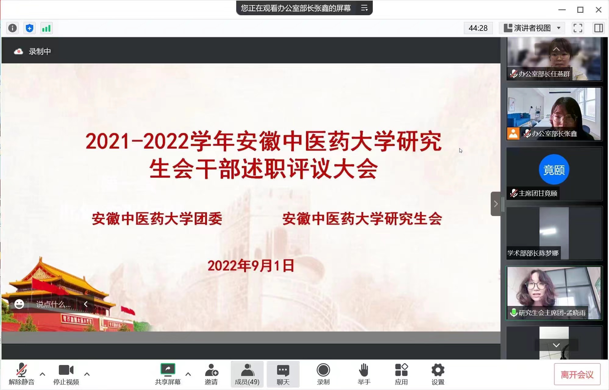 为深入贯彻落实《关于推动高校学生会(研究生会)深化改革的若干意见》等文件精神,加强学生会(研究生会)的组织建设,进一步深化校学生会(研究生会)改革,支持和引导学生会组织更好地服务青年成长成才,我校于8月28日、9月1日分别开展线上学生会、研究生会学生干部述职评议。校学生处、团委老师,部分学生代表及校学生会(研究生会)所有成员参加此次会议。