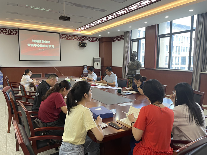 9月14日上午,针灸推拿学院召开党委理论学习中心组学习会,学院党政领导、党委委员、支部书记参加学习,会议由学院党委书记蒋宏杰主持。