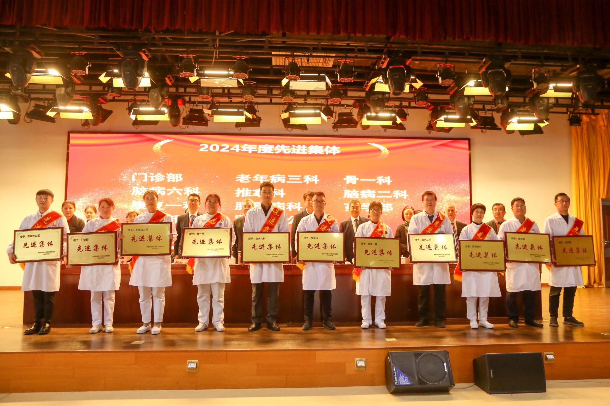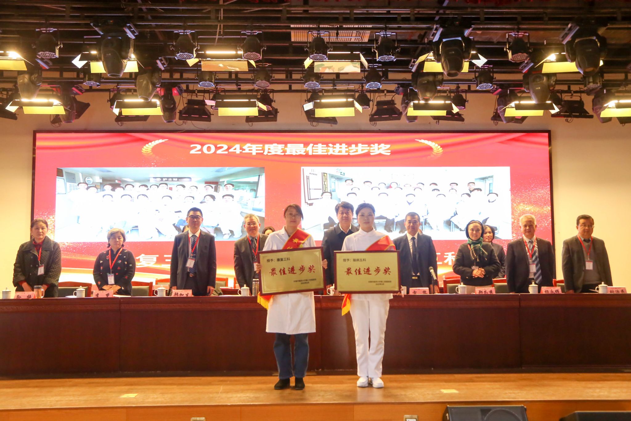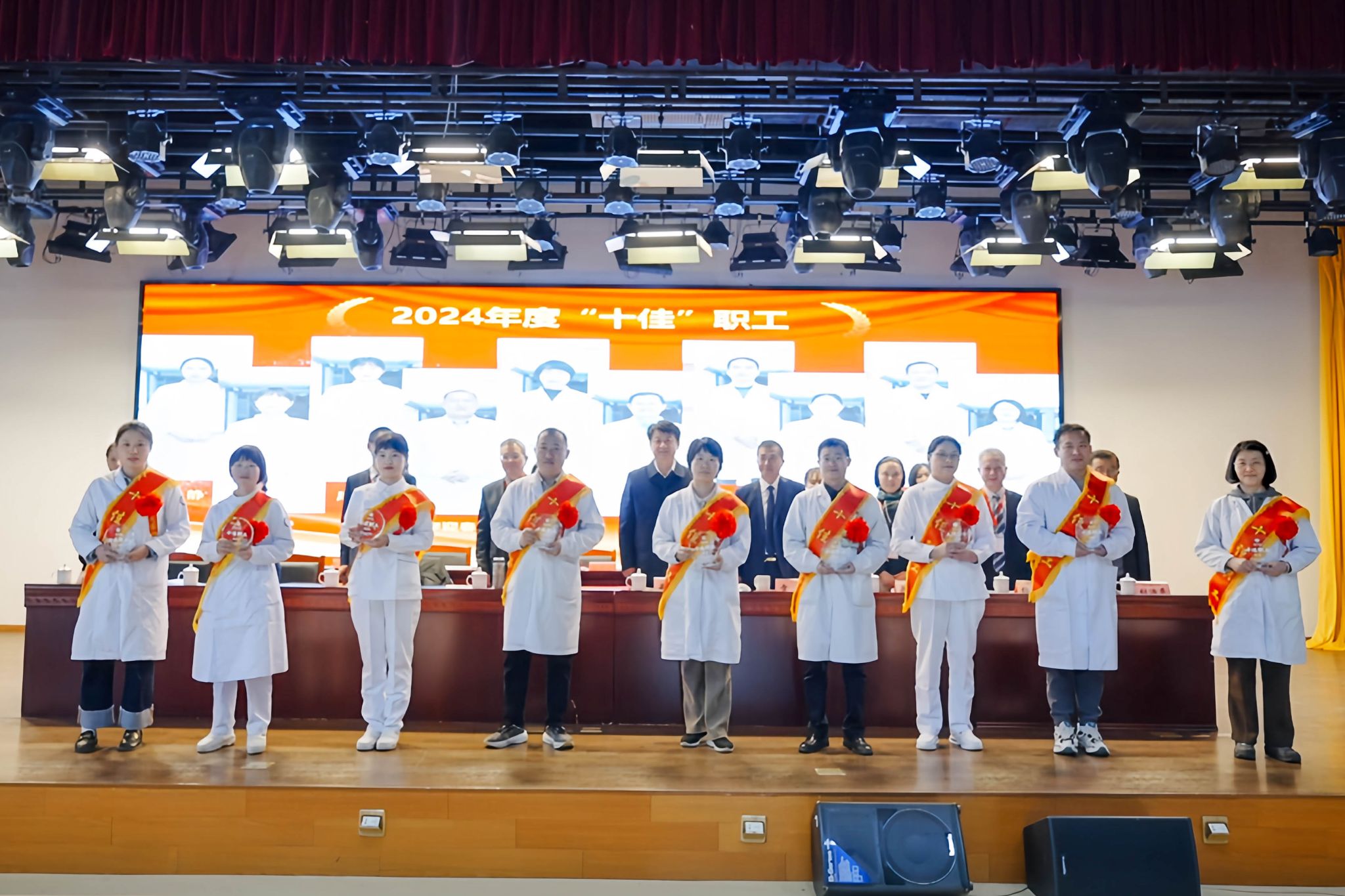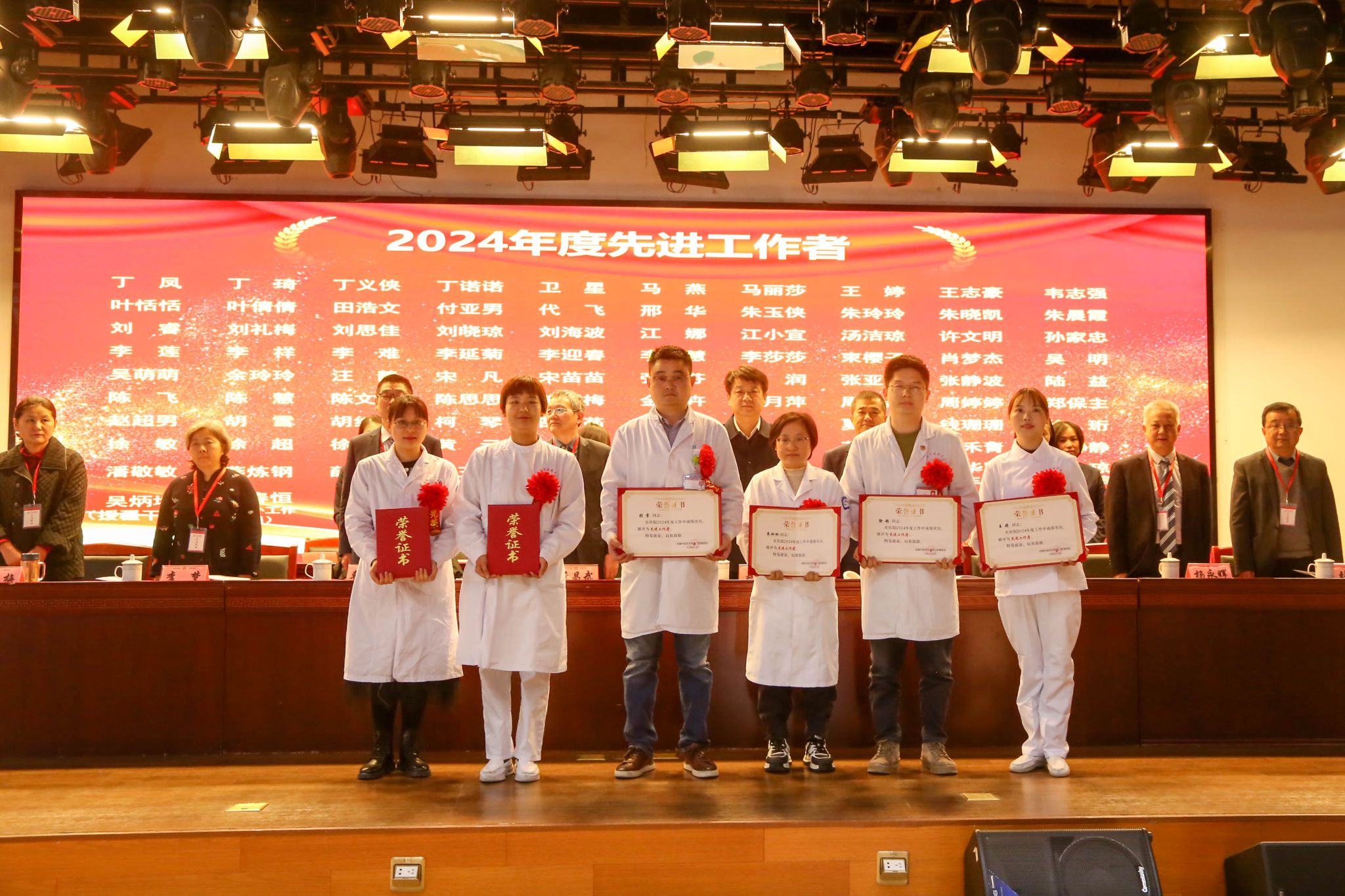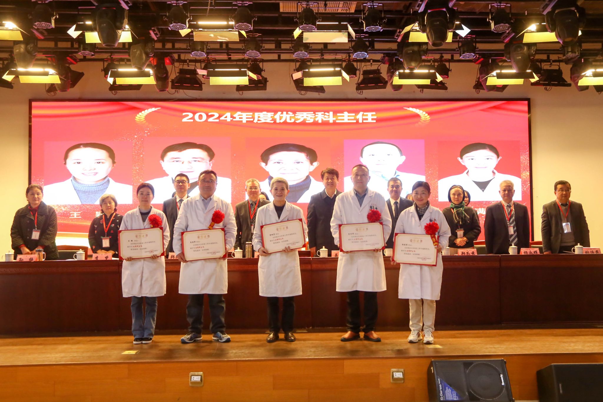 会议对2024年度“先进集体”“最佳进步奖”“先进工作者”“‘十佳’职工”“优秀科主任”“优秀护士长”“优秀管理工作者”和“爱院奉献奖”等先进集体和先进个人进行表彰。脾胃病科李学军代表先进集体发言,护理部吴兆梅代表先进个人发言。