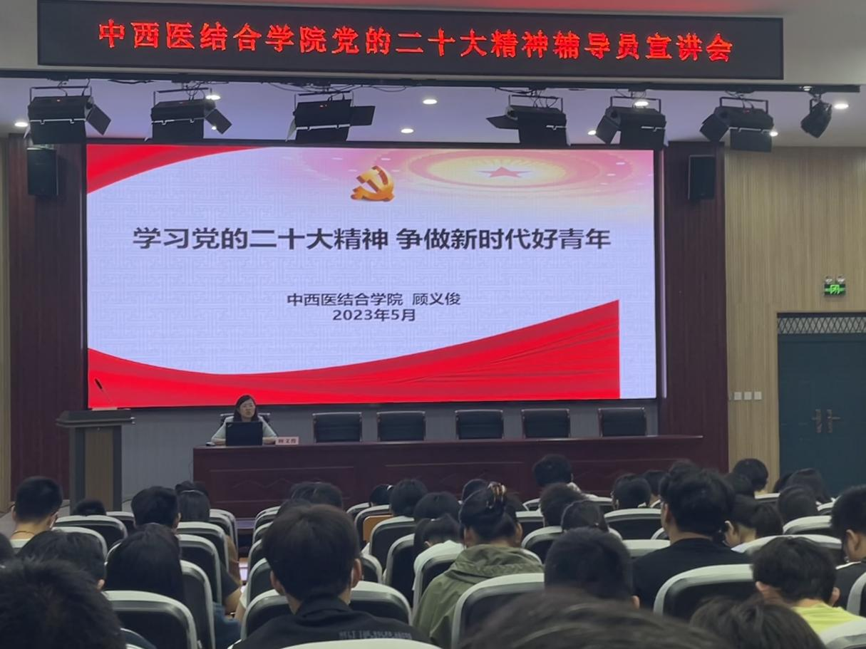 为深入学习宣传贯彻党的二十大精神,凝聚奋进力量,引导广大青年大学生坚定理想信念、勇担时代使命,5月26日下午,中西医结合学院在学院254学术报告厅开展党的二十大精神辅导员宣讲会。医药经济管理学院党委副书记彭青和、中西医结合学院党委副书记顾义俊和药学院辅导员周婧晗三位老师进行了宣讲,学院全体辅导员及2022级中西医临床医学专业学生代表参加。