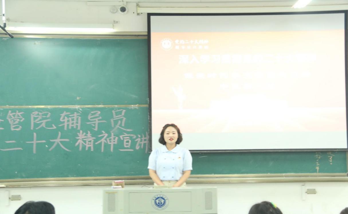 为全面深入学习贯彻党的二十大精神,引导同学们增强责任感和使命感,坚定理想信念,学好本领,成为担当民族复兴大任的时代新人,6月6日下午,医药经济管理学院在教学楼A205开展了党的二十大辅导员层面宣讲活动,医药经济管理学院辅导员彭青和老师、孙孝涧老师,针灸推拿学院辅导员陈佳佳老师进行宣讲,2021级、2022级部分学生代表参加。