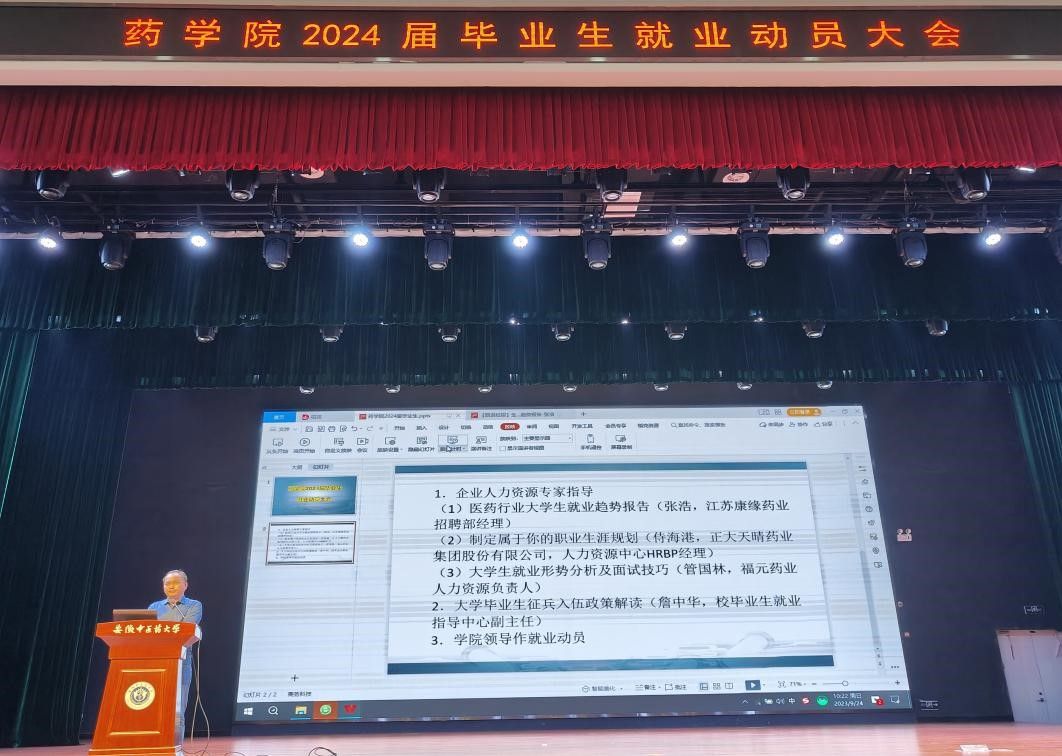 9月24日上午,药学院在大学生活动中心召开2024届毕业生就业动员大会,校毕业生就业指导中心副主任詹钟华、福元药业人力资源负责人管国林、江苏康缘药业招聘部经理张浩及正大天晴药业集团股份有限公司人力资源中心 HRBP 经理侍海港等作为特邀嘉宾出席会议。药学院毕业班辅导员和2024届全体毕业生参会。