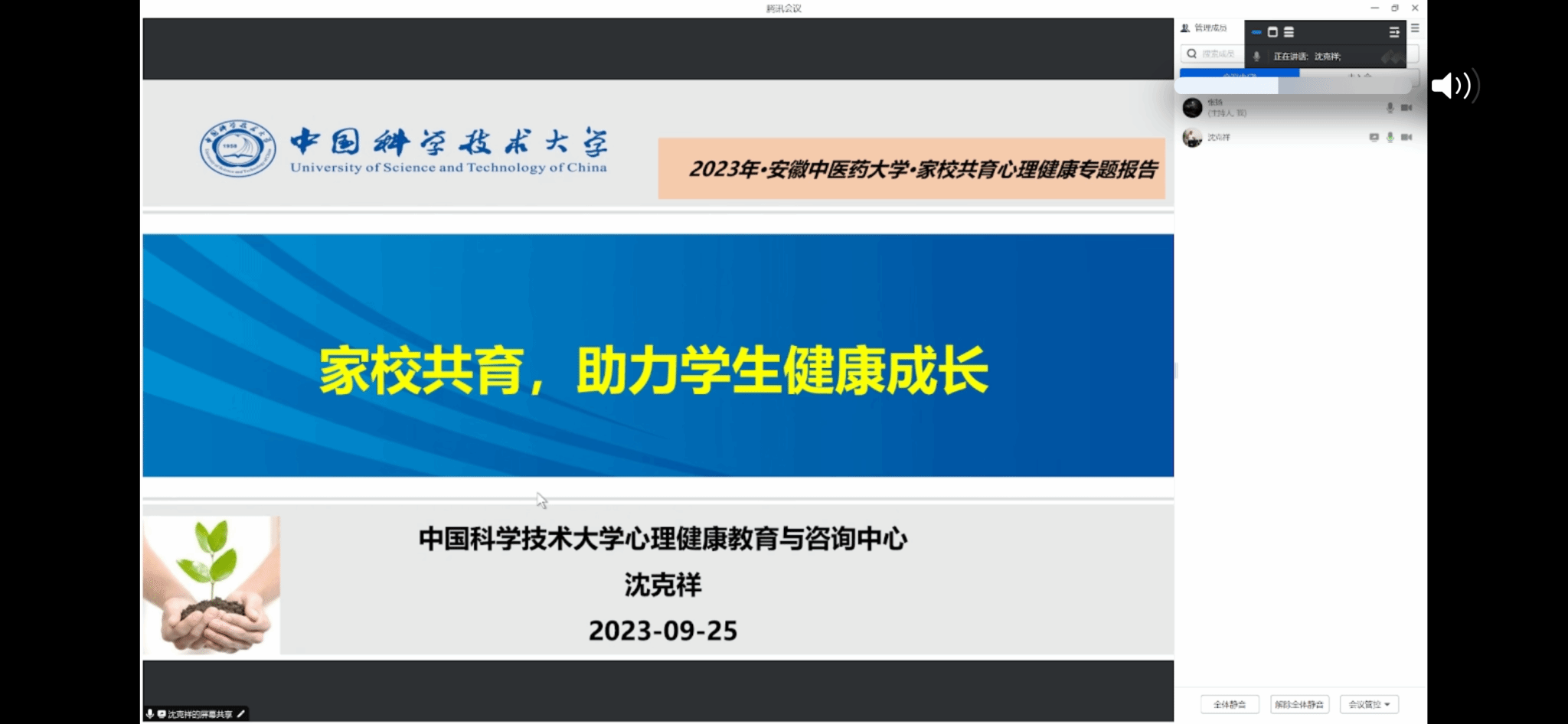 为全面提升我校大学生心理健康素养,打造家校社协同心理育人常态化体系,9月25日晚,由学生处主办、人文与国际交流教育学院协办的2023级新生家长心理课堂线上讲座成功开展。本次新生家长心理讲座特邀中国科学技术大学心理健康教育与咨询中心主任、注册心理师、国家二级心理咨询师、国家高级家庭教育指导师沈克祥主讲。他以《家校共育,助力学生健康成长》为主题,用生动的语言、独到的见解为新生家长普及了有关心理健康的专业知识。讲座由学校学生处副处长张扬主持,共三千余人次观看线上直播。
