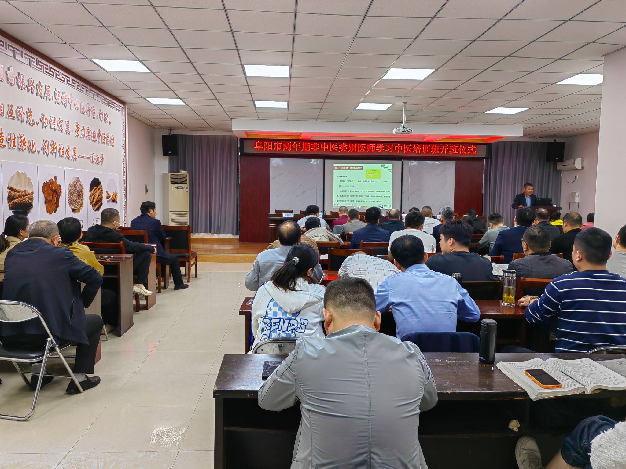10月14日,阜阳市2年期非中医类别医师学习中医(简称“西学中”)在阜阳市中医医院顺利开班。阜阳市卫生健康委副主任闪旭、中医科科长刘海彬,阜阳市中医医院党委书记宁南义,安徽中医药大学医药经济管理学院党委书记冯鑫、继续教育学院副院长章登飞、研究生院副院长胡建鹏、医药经济管理学院党政办负责老师出席开班仪式。阜阳市各级各类医疗卫生机构的66名西医师参加开办仪式。开办仪式由医院科研部科长朱广宝主持。