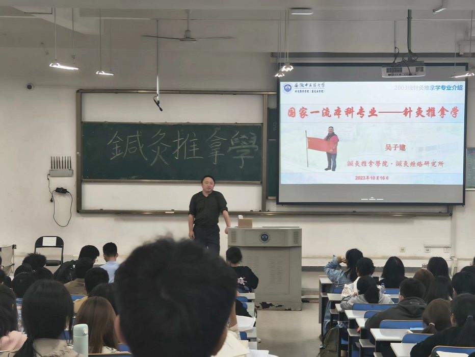 吴子建为2023级针灸推拿学专业全体学生进行了一场生动且富有指导意义的专业解读讲座。在演讲中,吴子建从建校建院史、专业建设的改革特色、举措和成效以及大学生如何学好针灸推拿学这三个角度深入浅出,详细解读了我校针灸推拿专业定位、特色优势、未来就业前景,并结合针灸推拿专业特色给大家未来的学习规划提供了新的思路,希望同学们利用好大学五年的宝贵时光,培养自学能力,扎实专业基础,提高实践能力,实现自己的职业理想!吴子建勉励大家“思贵专一,不容浅尝者问津;学贵沉潜,不容浮躁者涉猎”。