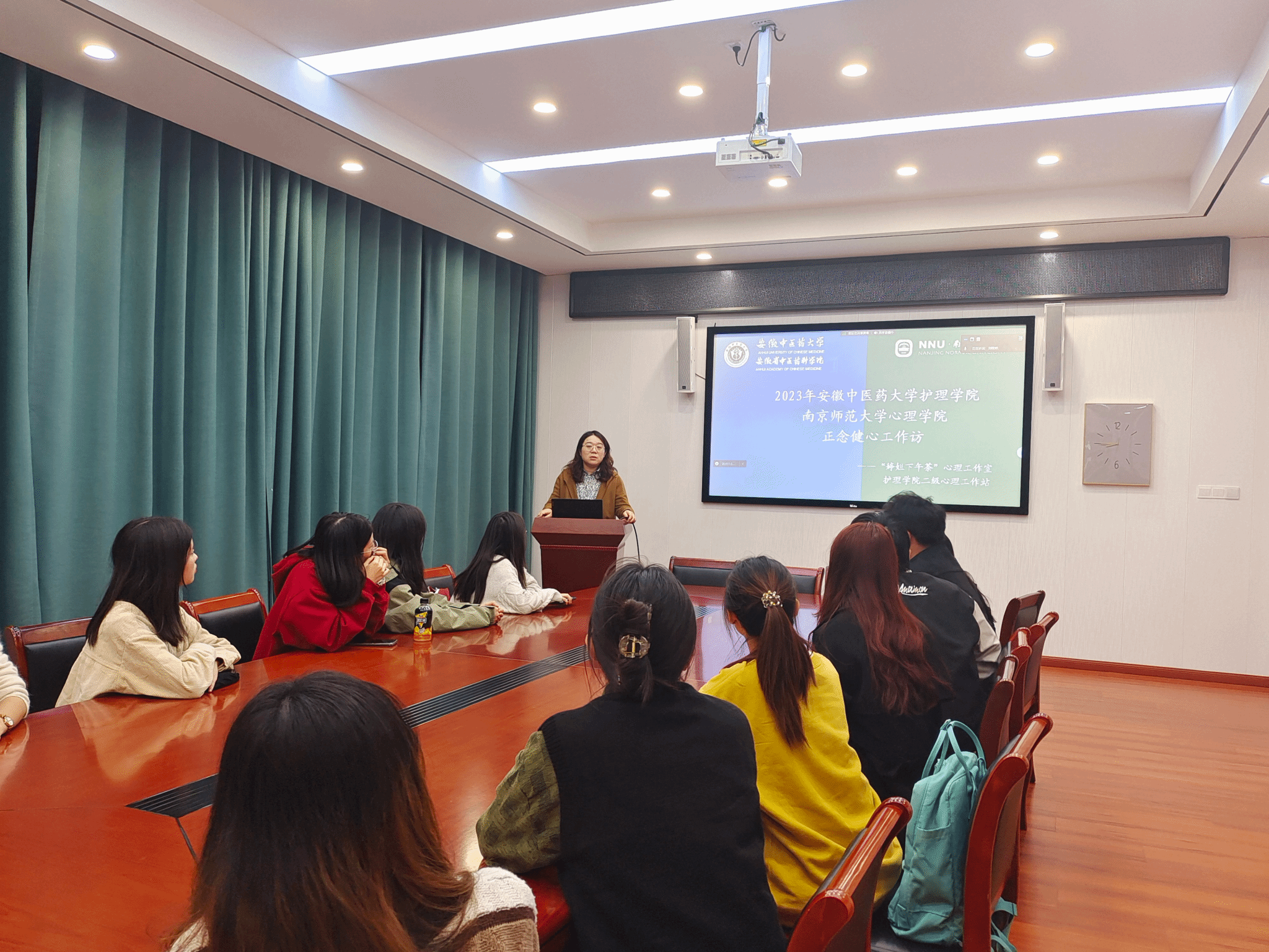 本次培训会上,还举办了安徽中医药大学护理学院二级心理工作站联合南京师范大学德育所开展的“正念健心工作坊”开幕式,南京师范大学德育所王伊萌老师就“正念”疗法深入交谈,提出培养“正念”的重要性,希望同学们了解正念,感受正念,体会正念,并学会运用冥想来改善自己的不良情绪, 提高心理认知的同时提高生活质量,保持专注力。有关正念冥想的学术知识,帮助大家拓宽科研视野,加强不同专业研究生之间的学术交流,营造浓厚的学术文化氛围。