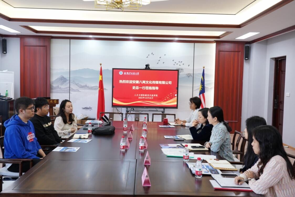 10月24日上午,安徽八两文化传媒有限公司总经理史栋一行三人到访人文与国际教育交流学院,洽谈校企合作相关事宜。学院党总支书记金晓琴、分管外事工作副院长昂文平代表学院热情接待史栋一行,实习就业办、留学生教育管理科、分团委等科室负责人参加座谈。