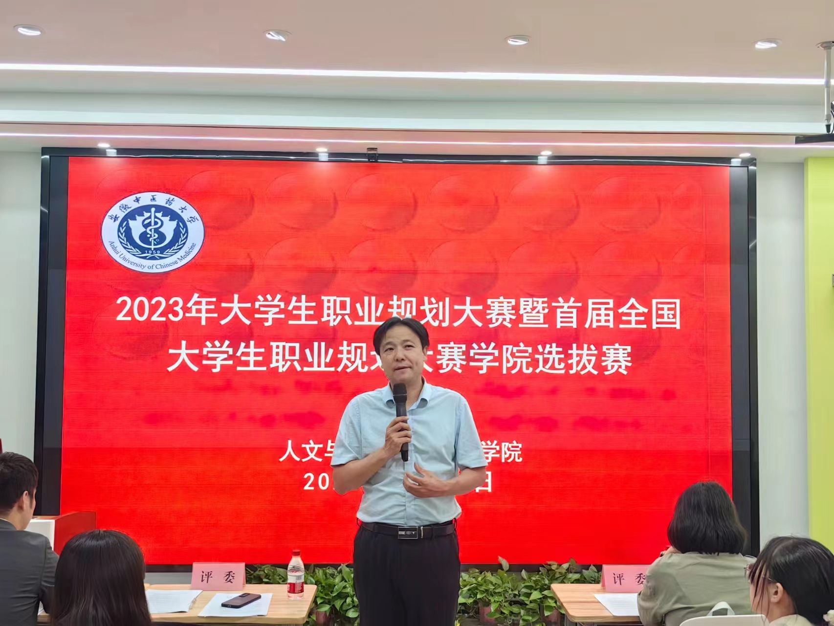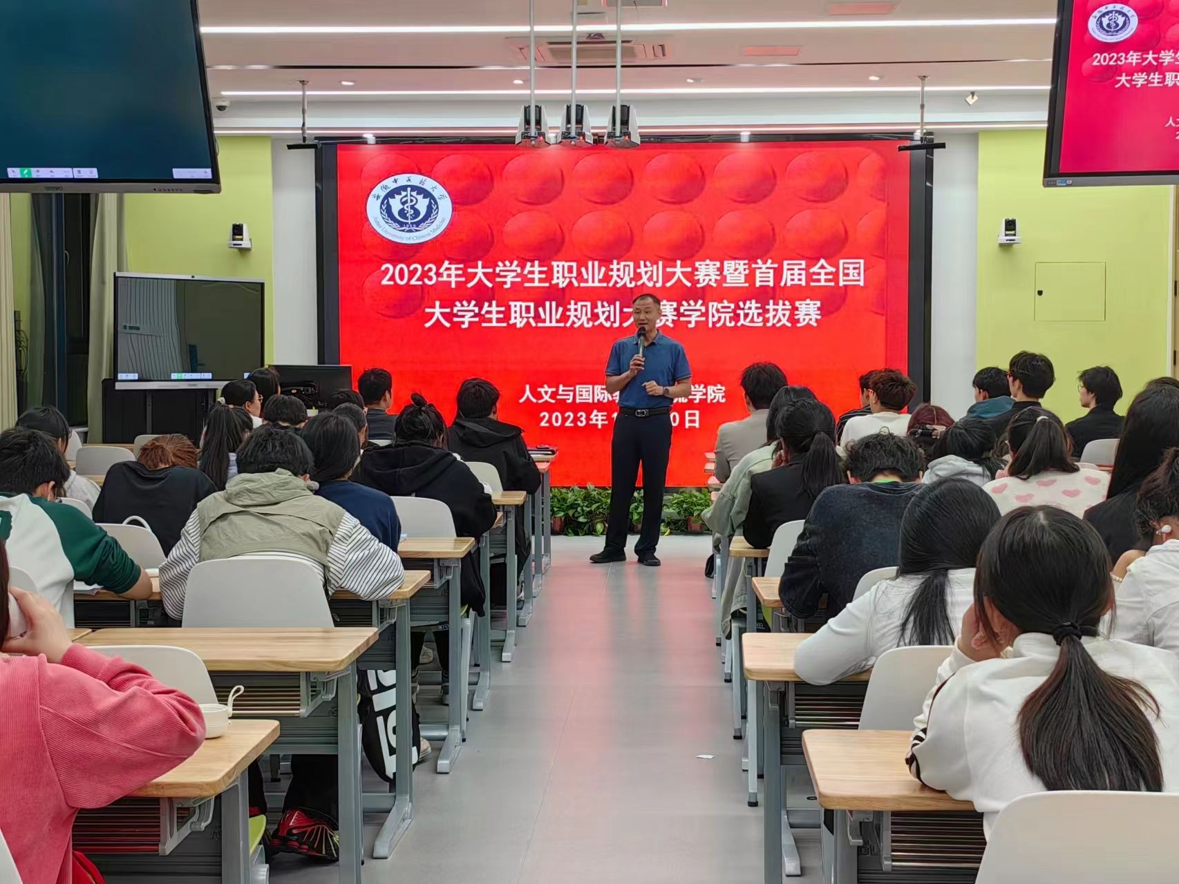 为了增强大学生的职业生涯规划意识,促进人才供需对接,服务毕业生就业大市场,10月30日,人文与国际教育交流学院在少荃湖校区教学楼B210-211智慧教室,举行2023年大学生职业规划大赛院级选拔赛,学生处副处长、大学生就业指导中心主任詹钟华,学院党总支副书记彭青和,大赛评委老师、部分高年级学生代表及2023级全体同学到场观摩学习。