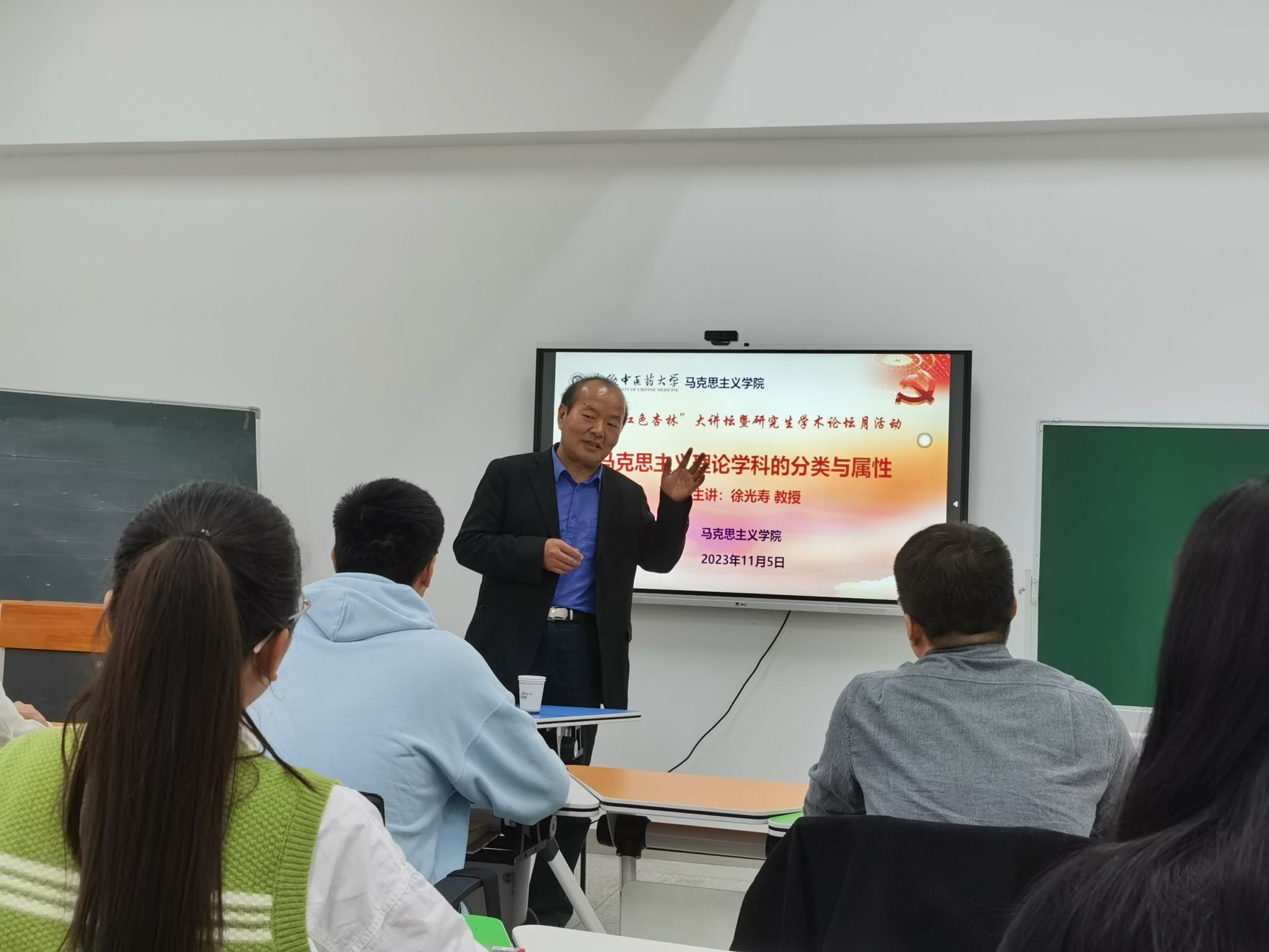 为提升马克思主义理论学科建设水平,加强研究生过程培养,提高研究生学术素养,11月5日,马克思主义学院“红色杏林”大讲坛暨研究生学术论坛月系列活动正式开启,首场活动邀请上海市中共党史学会副会长、上海立信会计金融学院徐光寿教授,安徽省党史研究院副院长、省社科联副主席施昌旺作学术讲座。2023级全体硕士研究生参加,马克思主义学院院长董玉节主持。