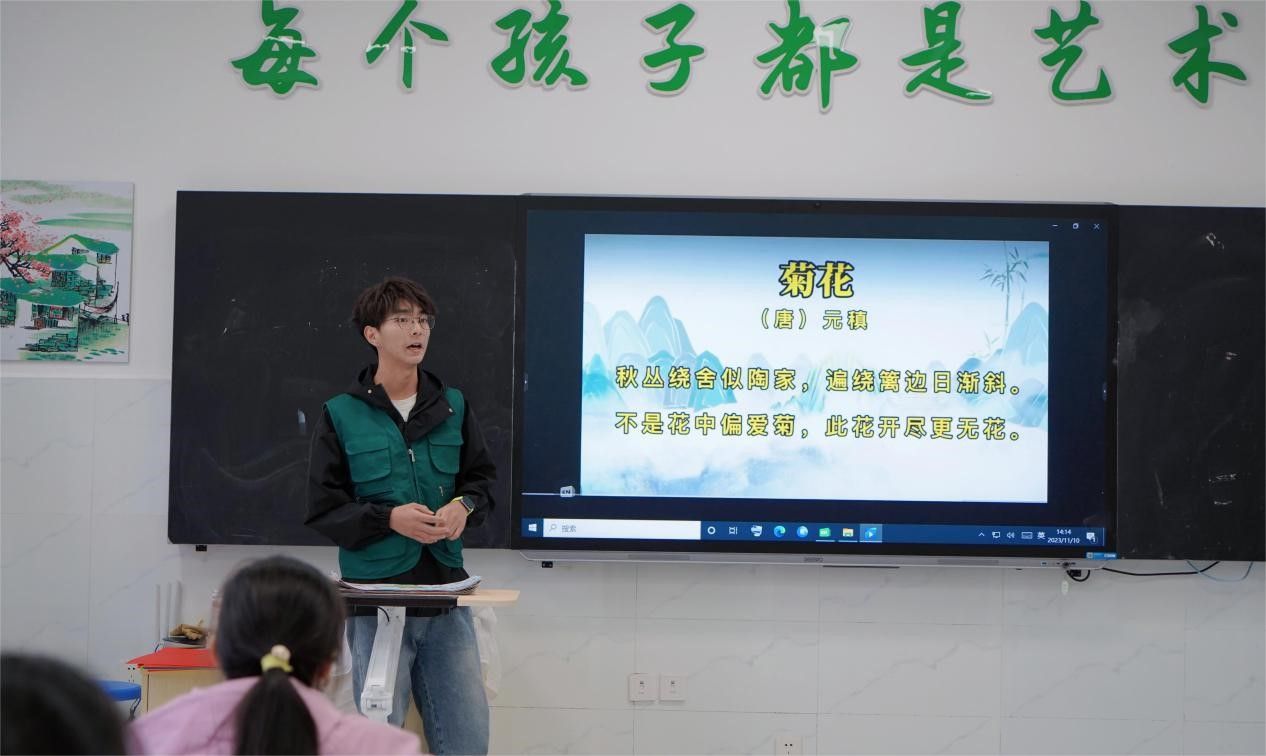 “采菊东篱下,悠然见南山。”“不是花中偏爱菊,此花开尽更无花。”课堂上,小学生们在学生志愿者的带领下齐声朗诵,感受菊花高雅纯洁、正直不屈的品质,体会古人对菊花的喜爱。