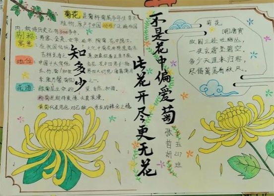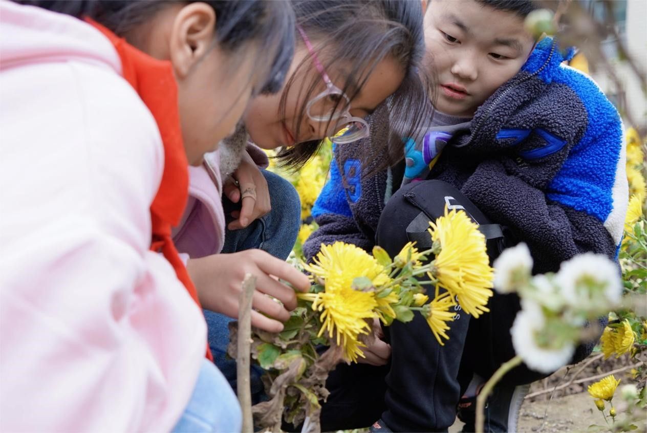 小学生们认真观察菊花形态,动手整理花枝,轻轻抖落灰尘,去除杂物……在制作过程中,他们不断尝试、调整,做出完美的标本或画作,提高了实践和创新能力。