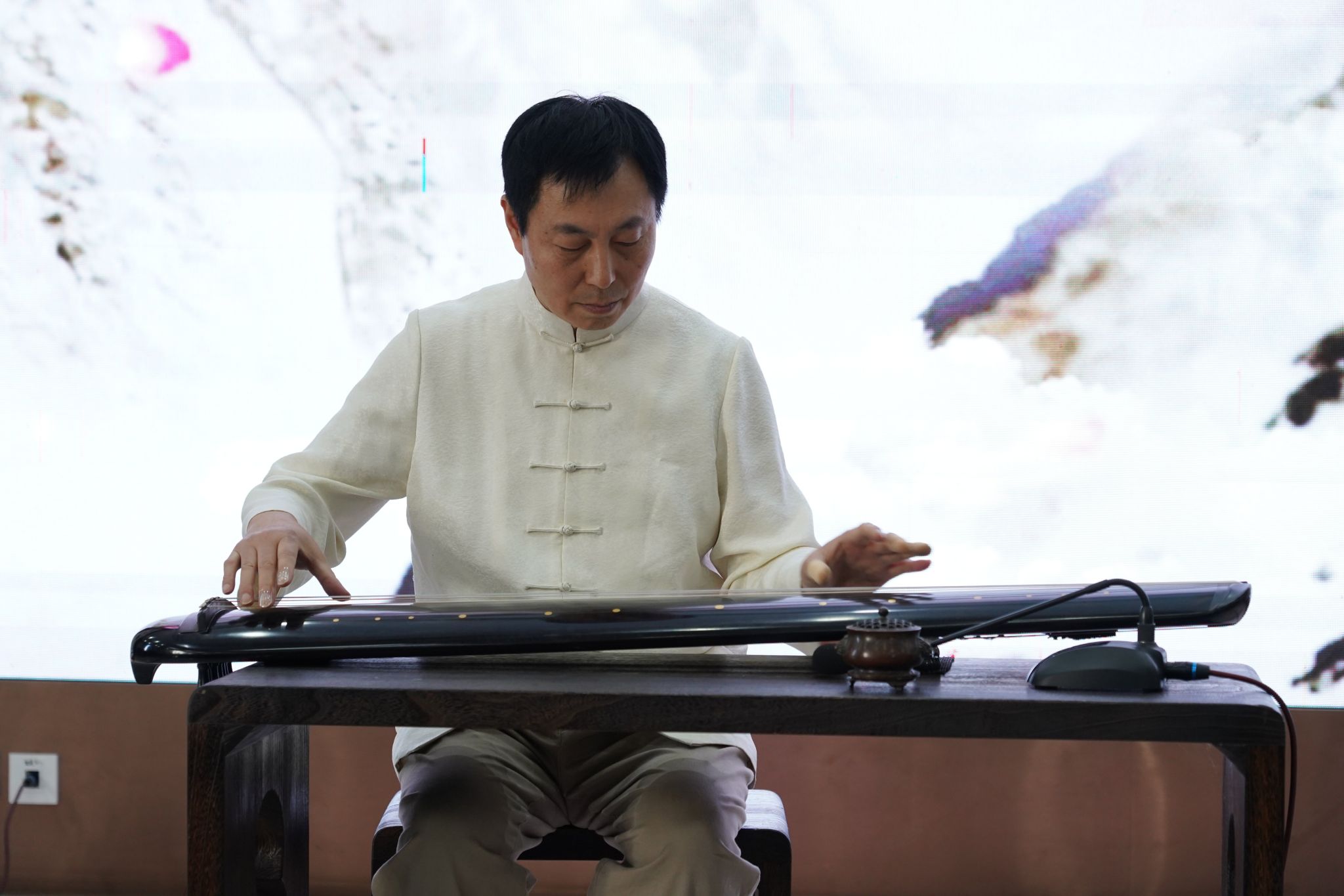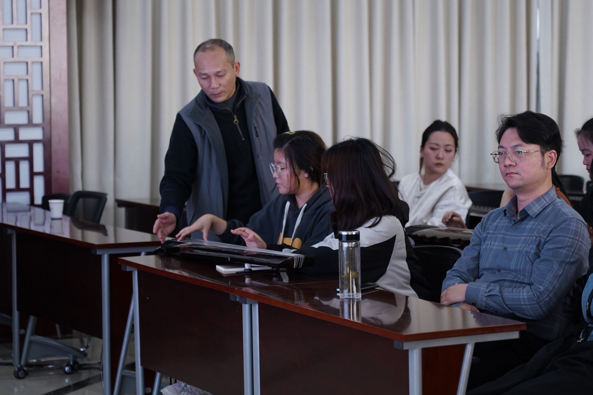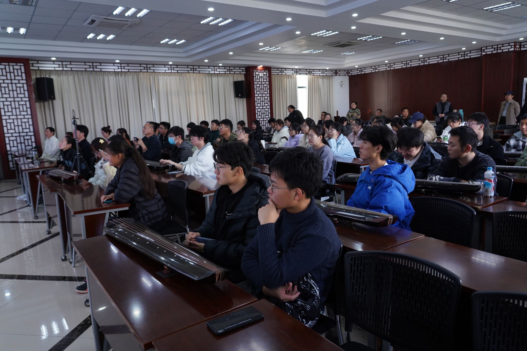 彭韬老师现场展示了《平沙落雁》《秋夜长》《秋风词》等古琴名曲,优美的琴仿佛带领人们穿越时空,感受到了古代音乐的魅力,大家纷纷陶醉其中。为了让学生们更好地参与进来,现场还准备了古琴演奏基础教学活动,让同学们动手尝试演奏古琴,感受琴弓的轻触,尝试发出第一声琴音。这种互动形式不仅激发了学生们的学习兴趣,也增加了他们对古琴音乐的深度理解。