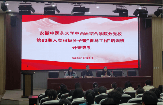 11月20日晚,中西医结合学院分党校第63期入党积极分子暨“青马工程”培训班开班典礼在学院254学术报告厅举行。中西医结合学院党委书记尹必武、党委副书记顾义俊及学院全体辅导员出席,93名参训学员参加典礼。