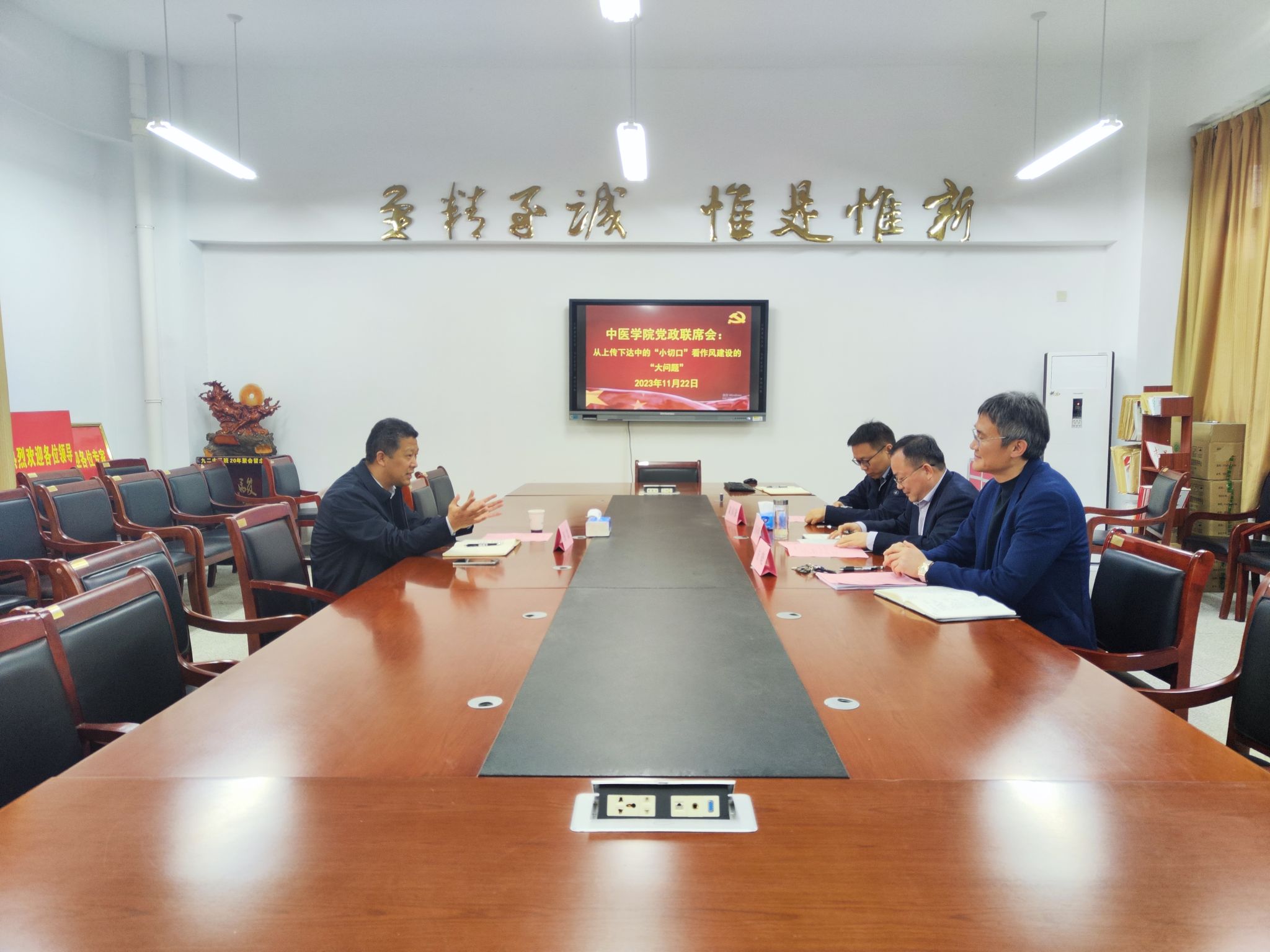 根据学校11月份二级党组织书记工作例会的要求,结合学校党建督查的通报,11月22日下午,中医学院召开主题为“从‘小切口’看作风建设的‘大问题’”的班子会议,具体谋划作风建设。学校党委常委、组织部部长田磊旁听会议。院长方向明主持会议。