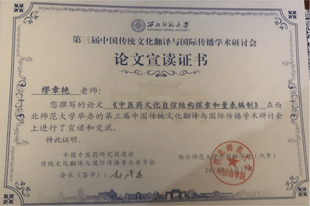 会上,我校外语系副教授缪章艳交流了论文《中医药文化自信结构探索和量表编制》并进行了学术研讨。(采宇/文图 金晓琴/审核)