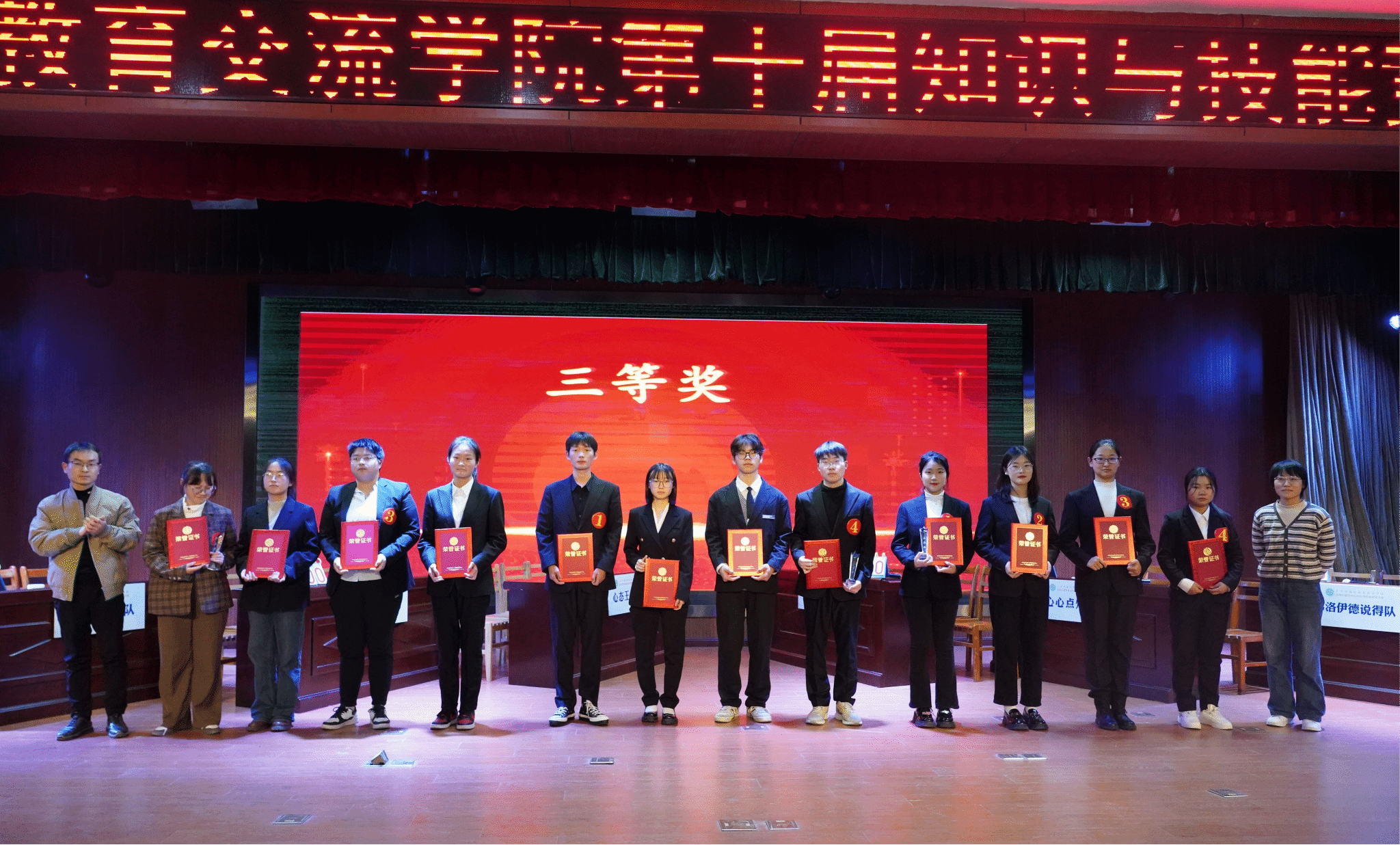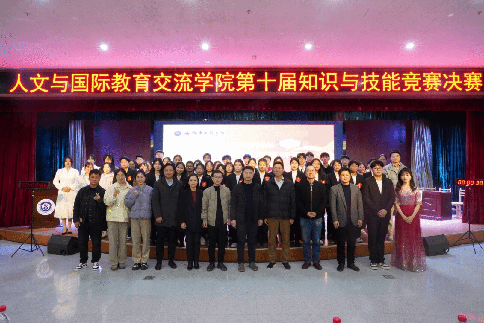 为激发大学生的学习热情,提高综合素质能力,11月30日晚,人文与国际教育交流学院应用心理学专业第十届大学生知识与技能竞赛决赛在图书馆一楼学术报告厅举行。大赛邀请学校教学督导尤吾兵教授、学校教务处副处长张晓军,学院应用心理学系副主任许胜、心理咨询中心教师张俊杰老师、康蓝青老师担任评委。学院党总支书记金晓琴、副院长张筱荣、副书记彭青和和全体辅导员出席此次大赛,学院24名选手组成了6支代表队参加了决赛,近300名应用心理学专业的同学观摩了本次大赛。