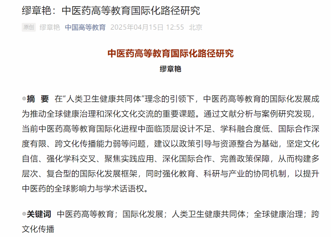 《中医药高等教育国际化路径研究》则聚焦在“人类卫生健康共同体”理念引领下,中医药高等教育国际化的现实挑战与发展路径。研究建议应以政策引导与资源整合为基础,增强文化自信、强化学科交叉、注重实践导向、深化国际合作、完善保障机制,构建多层次、复合型的国际化发展框架。同时,应加强教育、科研与产业之间的协同联动,进一步提升中医药的全球影响力与学术话语权。