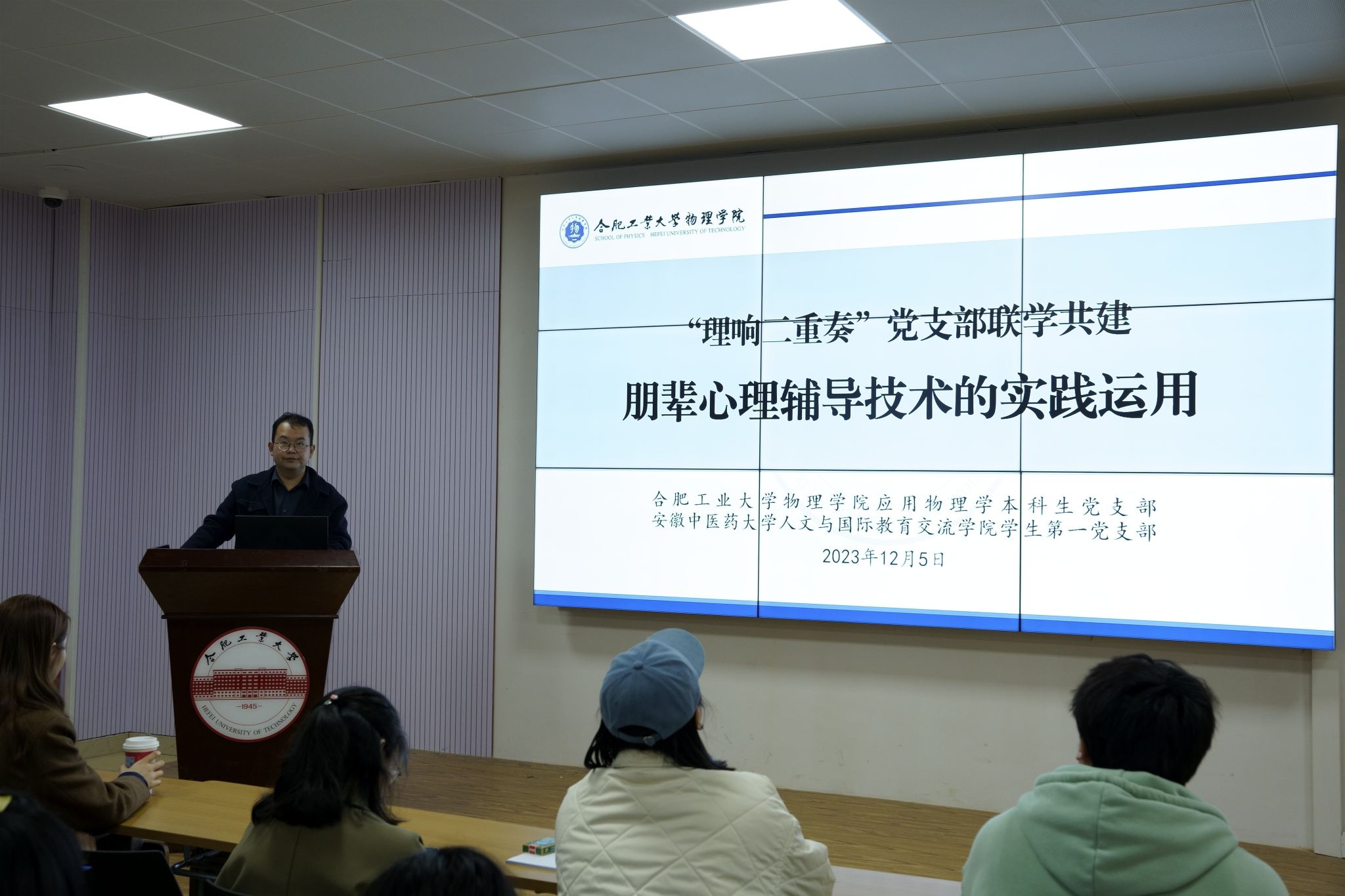12月5日,人文与国际教育交流学院组织学生第一党支部赴合肥工业大学翡翠湖校区开展支部联学共建活动,应该校应用物理学本科生党支部邀请,学校应用心理学专业学生党员为合工大学子带来了一场“干货满满”的朋辈心理辅导体验活动。