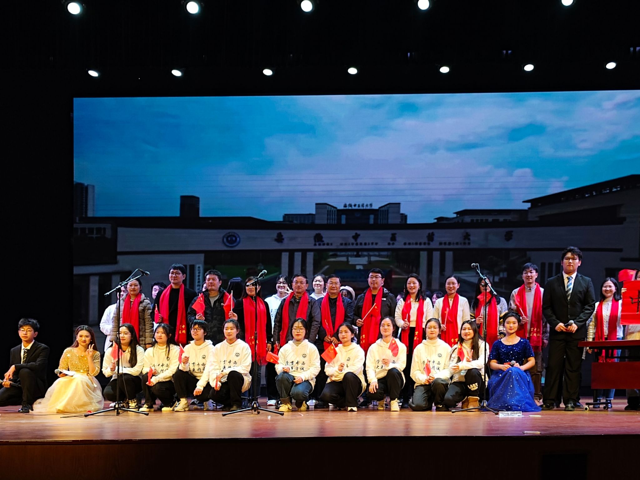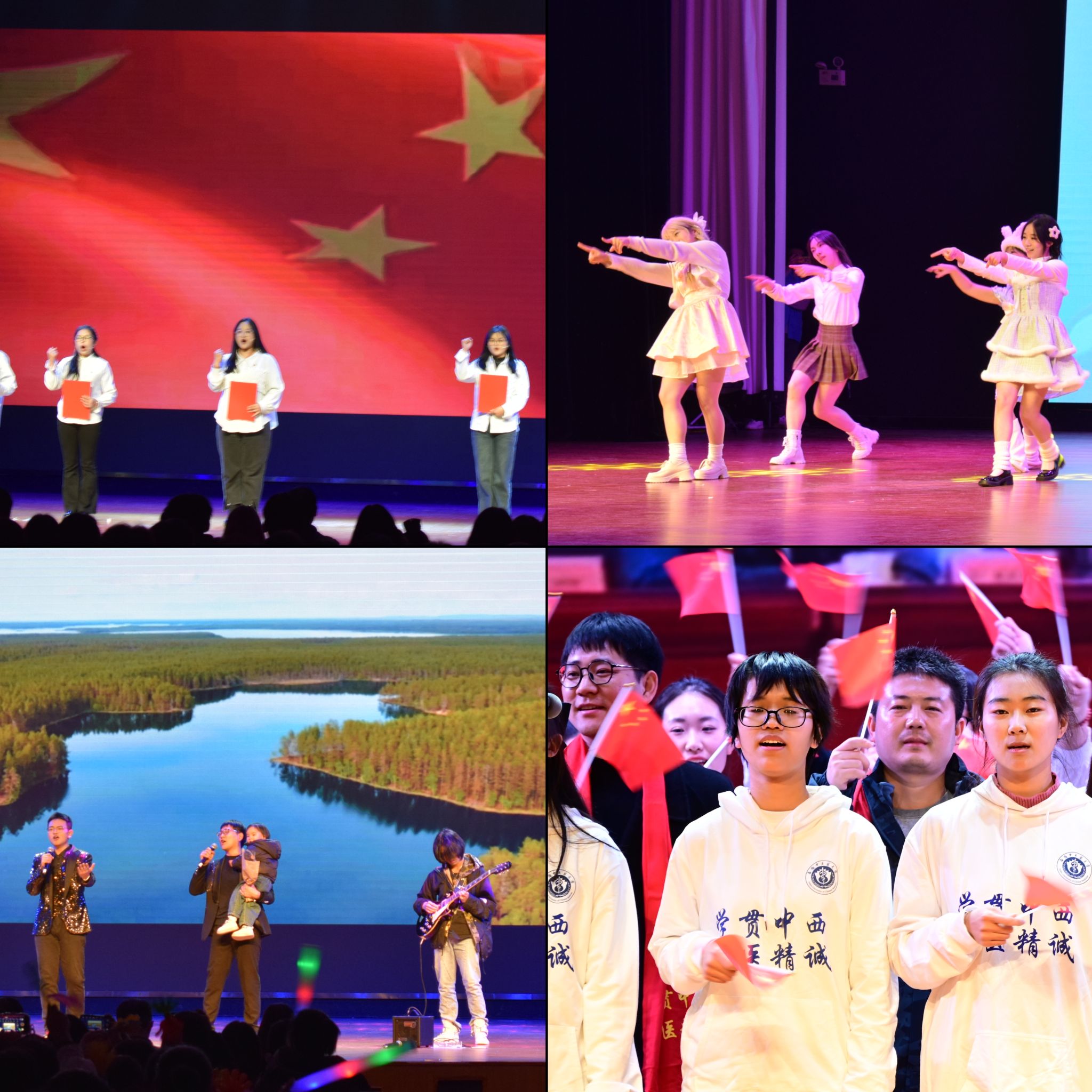 晚会分三个篇章,通过舞蹈、歌曲、朗诵、表彰等丰富的形式,在大学生舞蹈协会带来的开场舞《bubble》中拉开序幕,轻快的脚步和活泼的舞姿点燃了全场的热情。辅导员和学生们带来歌曲《海阔天空》,嘹亮动听的歌声击破寒夜,传达出对中西医学子的希冀和鼓励,将全场观众的欢呼声推向了更大的浪潮,学院学生党员带来的朗诵《致青春》,娓娓道来,讲述了青春献给党的故事,坚定了青年学子们对党的信仰、对祖国的忠诚。在师生同台的合唱节目《我相信》中,晚会徐徐落下帷幕,生动展现了中西医学子砥砺前行,不忘初心的使命担当。