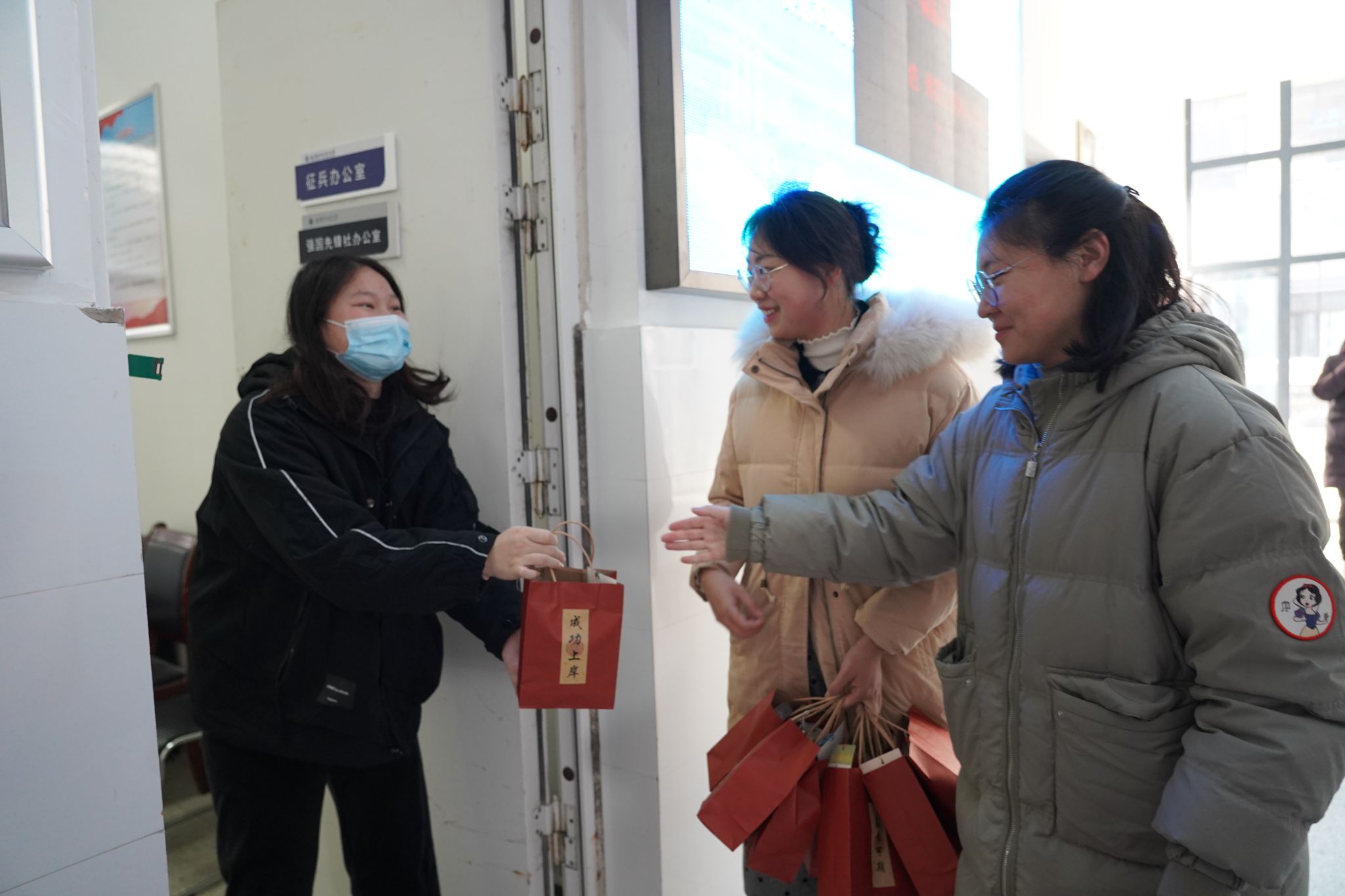 12月20日上午,人文与国际教育交流学院党总支书记金晓琴、副书记彭青和带领辅导员和部分同学前往图书馆自习室开展2024届毕业生送温暖活动,学院近180名毕业班同学都收到了一份特别“上岸大礼包”:苹果、橙子、考研文具套装,此外还有一份精心的祝福卡片。