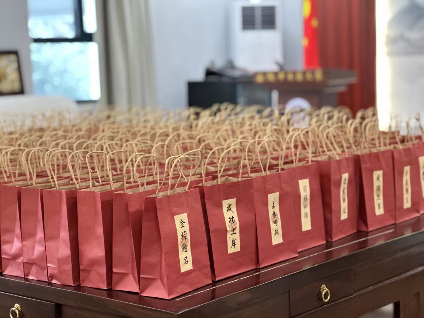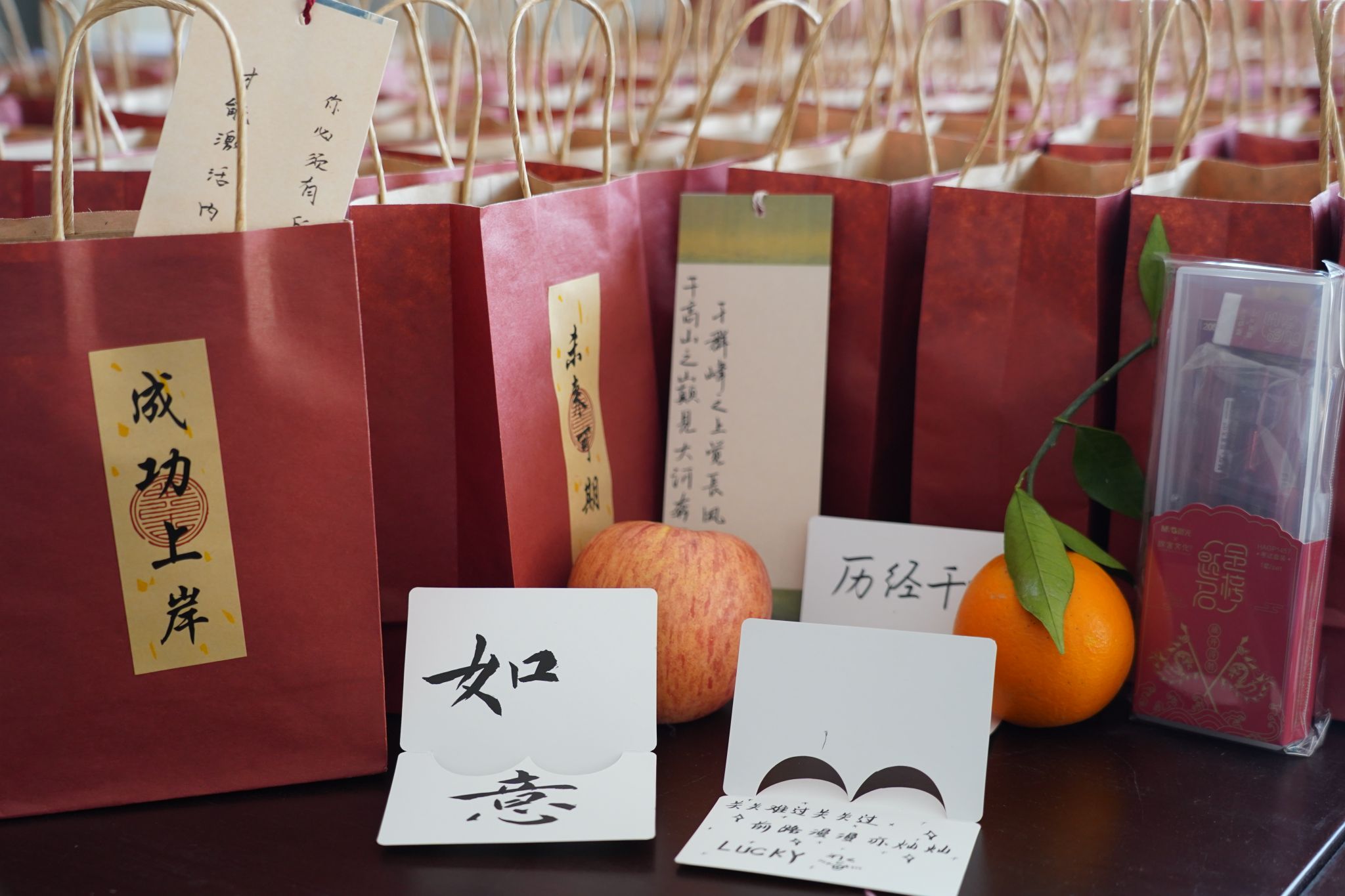 礼包上贴有“成功上岸”“前程似锦”“金榜题名”“未来可期”“逢考必过”等的字样,寓意着学校希望每位毕业生都能顺利通关,实现成功上岸的梦想。在“大礼包”考试文具套装则包含了考试所需的各种文具,为考生们提供便利。除此之外,礼包内还有苹果、橙子等寓意深远的食物,希望考研学子可以“苹苹”安安、心想事“橙”,顺利应考,出色发挥,成功上岸。