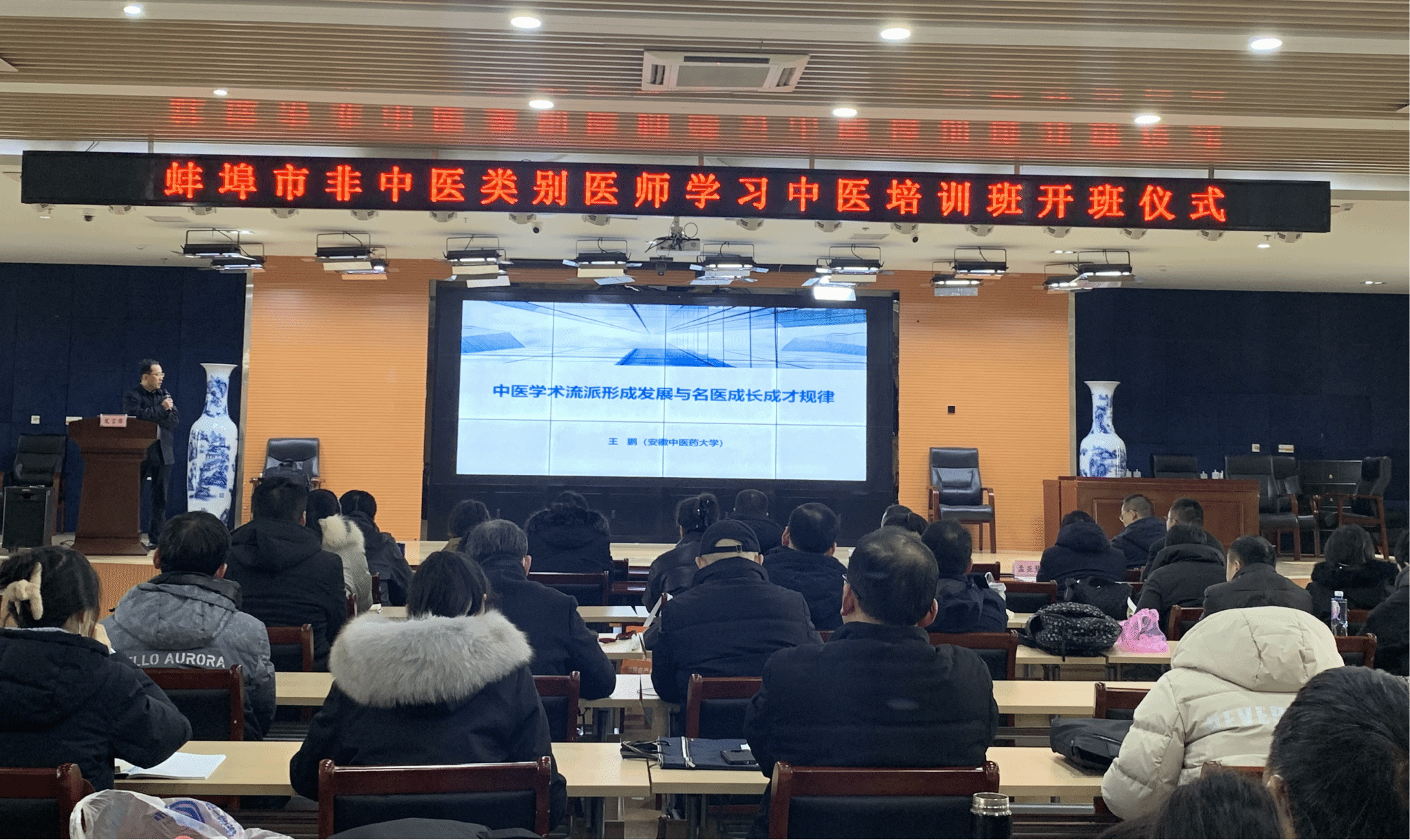 1月27日,蚌埠市非中医类别医师学习中医(简称“西学中”)培训班在蚌埠市中医医院开班。安徽省中医药管理局中医药发展处一级调研员张洁,蚌埠市卫生健康委副主任黄莺,我校继续教育学院院长方正清、研究生院院长王鹏、护理学院党委书记苏本江、图书馆古籍部主任邓勇,蚌埠市中医医院党委书记翟红兵、院长崔北勇出席开班仪式。来自蚌埠市各级各类医疗卫生机构的99名西医师、蚌埠市中医医院、学校护理学院相关人员参加了开班仪式。崔北勇主持开班仪式。