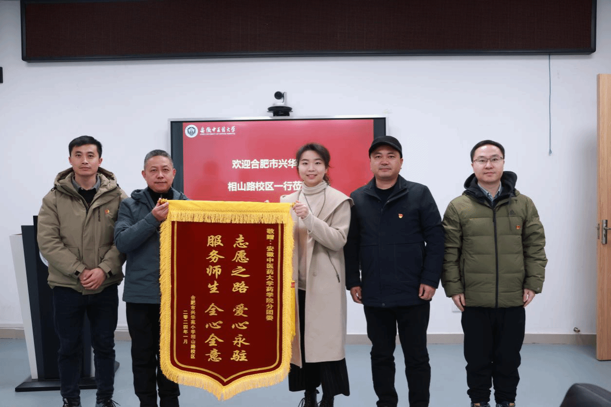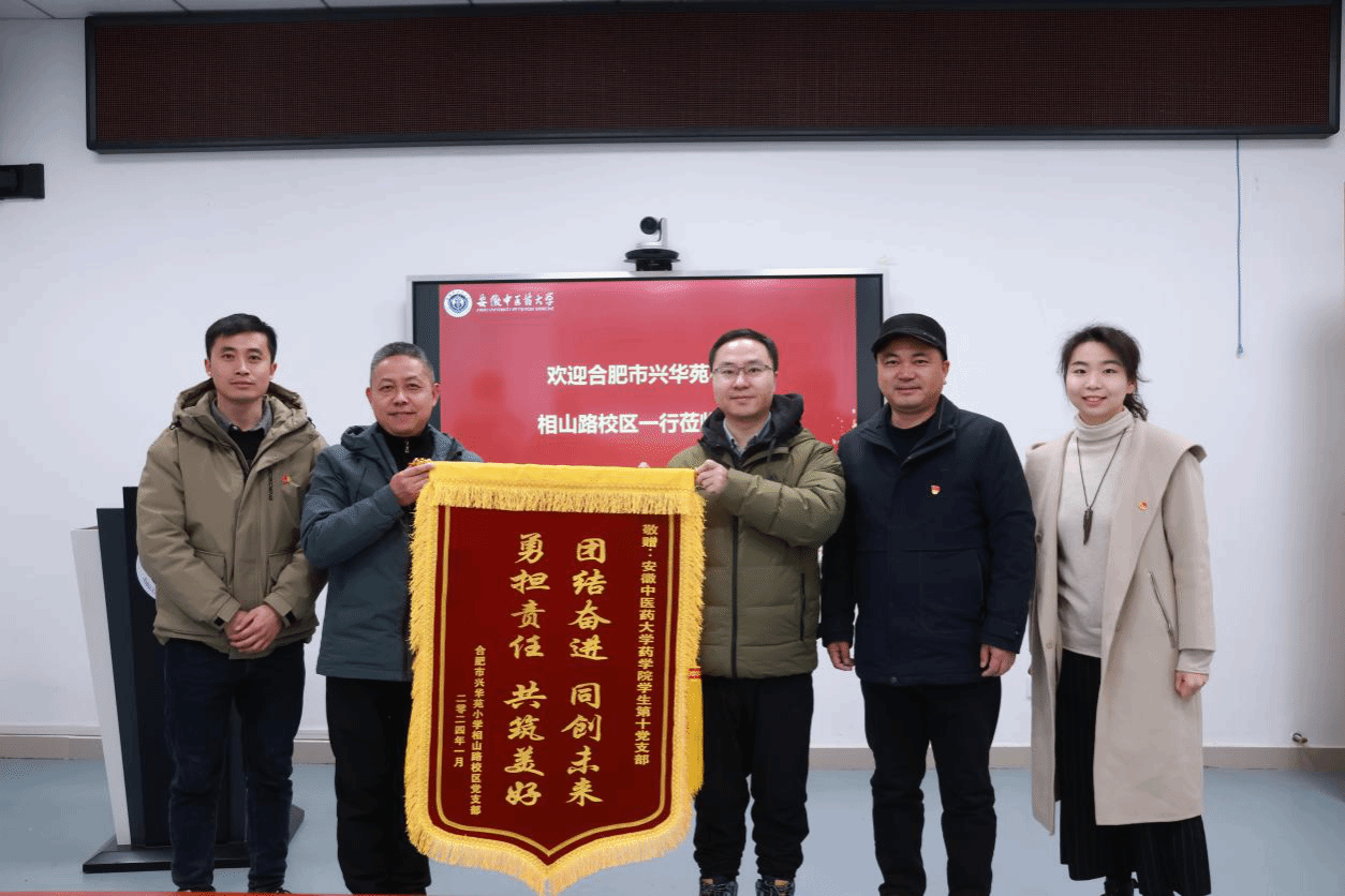 近日,药学院分团委、学生第十党支部收到了合肥市兴华苑小学相山路校区送来的红色锦旗,为药学院分团委、学生第十党支部在过去一年间,积极主动志愿校区,安排党员团员、青年志愿者进校园,开展各类中医药文化宣传科普活动,表达高度的赞扬和诚挚的感谢。合肥市兴华苑小学相山路校区校长杨勇一行,与药学院党委副书记徐先韬等展开座谈交流。
