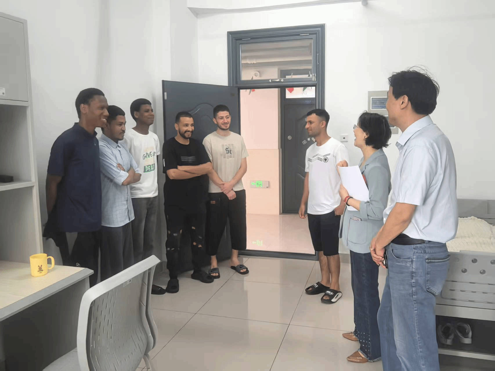 在来华留学生宿舍,老师们认真询问了学生在学习、生活和课外活动上的意见和建议,了解了学生对中国戏曲、书法、五禽戏等方面的热爱与需求,并对留学生的出行计划、出行安全做了摸排和宣传,向留学生们传递了学校的关心与温暖。(周政、魏子琦/文图 叶兰兰/审核)