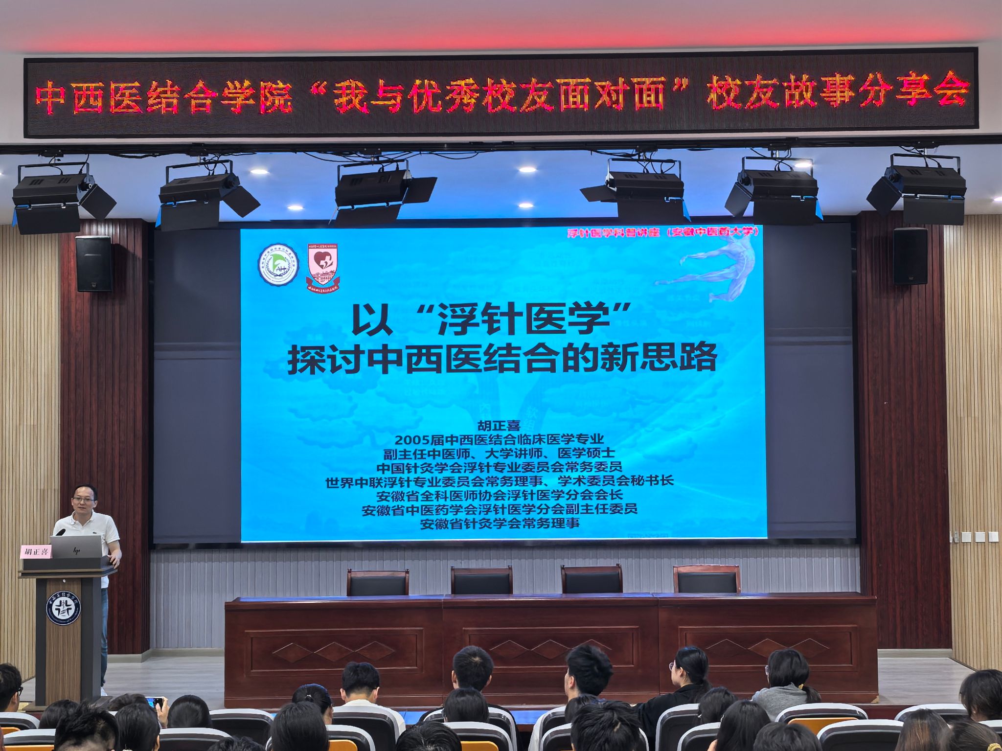 2005届校友胡正喜首先作了题为“以‘浮针医学’探讨中西医结合的新思路”的主题分享,通过真实病例视频展示了浮针疗法的显著疗效,让同学们对浮针疗法有了初步的了解。并详细介绍了浮针疗法的发展历程、作用原理及操作要点,他特别提到博士生导师符仲华教授发明浮针的艰辛历程,强调浮针疗法的科学性和创新性,激发了同学们对中西医结合技术的浓厚兴趣。