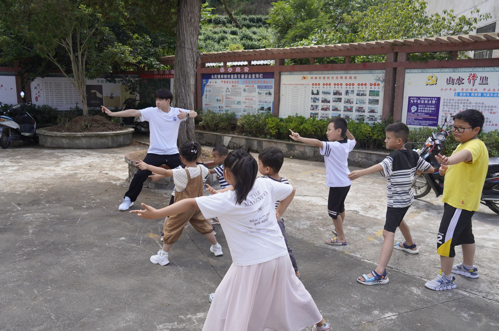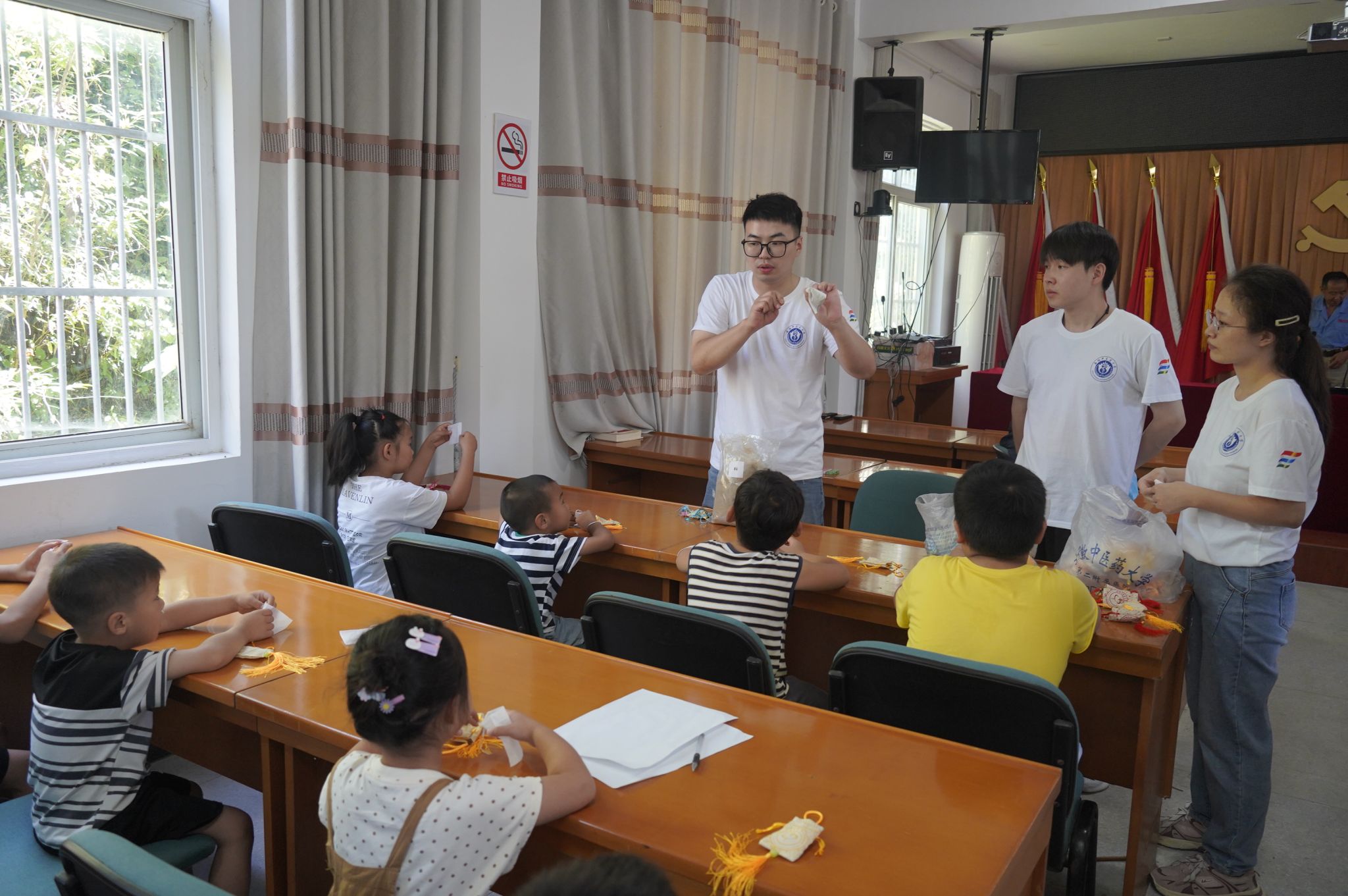 “志愿支教暖民心,杏芽启智育新苗。”为弘扬和传承中华优秀传统文化,关心培养孩子们对中医药文化的兴趣爱好,普及中医药文化知识。志愿者们在梓树村村委会开展了“传承中医经典,弘扬中华国粹,学做小小中医”活动,与小朋友们共同感受中医文化的魅力。活动中,实践队员用浅显易懂的语言给孩子们介绍什么是中医,实践队员绘声绘色的讲解并带领孩子们做起了八段锦,让岐黄文化薪火相传。在实践队员的引导下,小朋友们将中药粉一勺勺装进香囊内。捧着自己亲手制作的香囊,兴奋之情溢于言表,闻着小小香囊里的药香,他们不仅感受到了中药的魅力,似乎也嗅到了中医药文化的悠长久远和博大精深。浓浓情谊藏香囊、缕缕药香育新人。制作中药香囊,教学八段锦,传承中医健身智慧,中医药知识趣味竞答,普及中医药文化;开展防溺水安全知识讲座,保证留守儿童暑期安全。