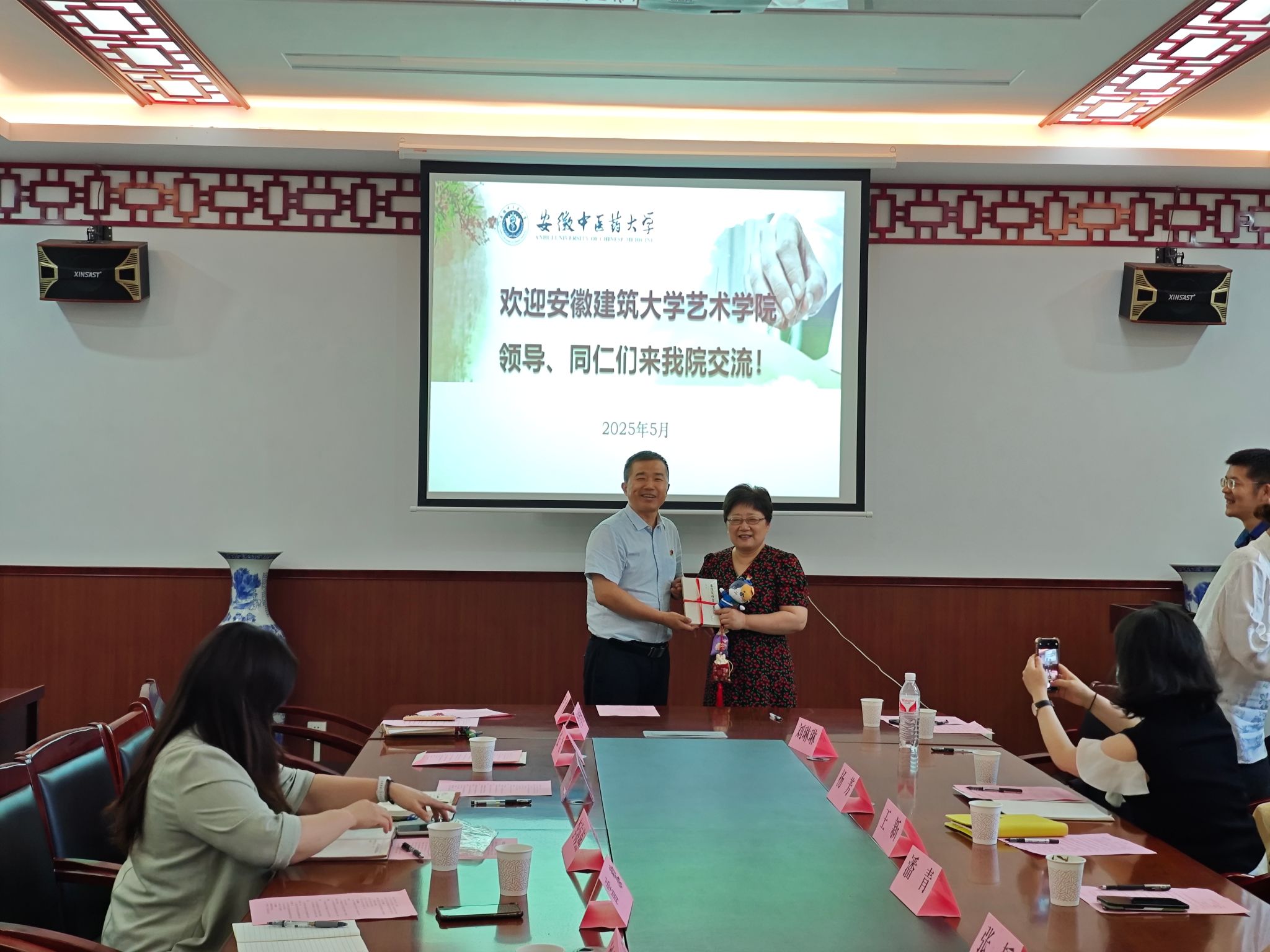 安徽建筑大学艺术学院各支部介绍了工作经验和取得的成果,学院教工第二党支部书记张雷、学院康复养生系主任陈朝晖分别就支部、系部建设情况进行简要介绍。活动现场,潘青与雷黎互赠《秦汉简牍医方集注》和“大医精诚”书法作品。