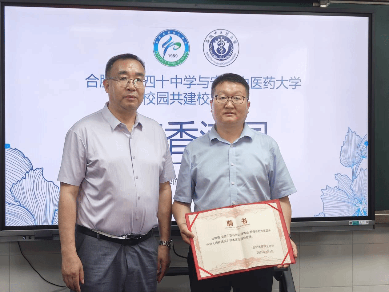 仪式上,合肥市第四十中学书记、校长甘宁东首先致欢迎辞,表达了对与会领导嘉宾的热忱欢迎和衷心感谢,希望通过校课合作,让学生们能更好地领略中医药文化魅力、拓宽知识视野。合肥市第四十中学副校长程曙辉详细介绍了学校劳动基地及校本课程开设的相关情况,让全体领导嘉宾对学校现有的劳动实践基础以及课程开展状况有了全面清晰的认识。随后举行了安徽中医药大学大学生社会实践基地揭牌仪式,并为来自两位校本课程指导教师颁发了聘任证书。最后,参会人员一同参观了校内的中草药种植园。