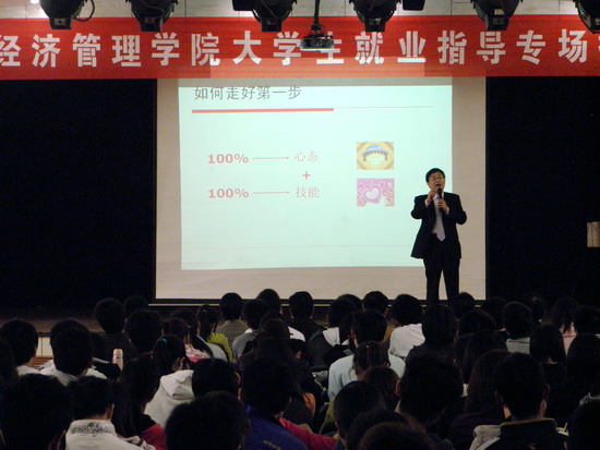 郭佩军从成功的三要素“喜爱、擅长、经济引擎”出发,结合大学生的现实生活,旁征博引,举例生动,赢得现场阵阵掌声。他希望大学生要树立正确的就业观,正确对待销售工作的挑战性和艰巨性,忍耐住创业之初的辛苦,保持积极阳光的心态,把别人的拒绝当成温暖的春风,有持之以恒,永不放弃的精神状态。他还勉励大学生要抛弃“打工者”心态,有创业的勇气,有做事业的决心,用自己的青春激情来打拼生活,实现梦想。