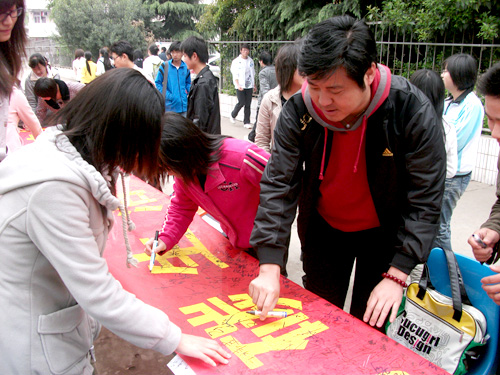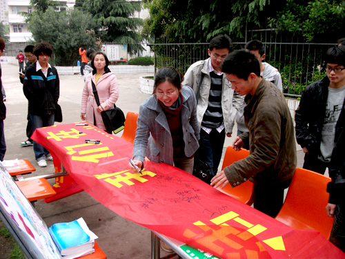 今年世界地球日是以“珍惜地球资源 转变发展方式 倡导低碳生活”为主题,同学们通过制作宣传展板、举办“低碳生活,我们在活动”签名活动、分发宣传单、播放音像资料等方式,引导我校大学生节约资源、保护环境、爱护地球,从小事做起,从身边事做起。