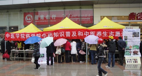 为了更好的普及中医药知识和养生保健常识,弘扬中医药文化精神,近日,药学院在国购广场组织开展了“中药知识普及和中医养生”志愿者活动,邀请了专家徐文龙教授、王德群教授、周建理教授及中西医结合医院部分医师进行义诊咨询,该院党总支副书记张亚辉亲临现场。