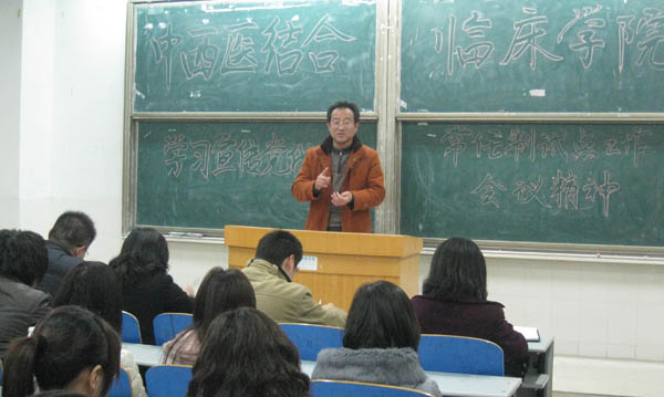 3月17日,中西医结合临床学院召开全院教职工大会,该院党政领导申国明、吴成长、方正清、顾义俊出席会议,全体教职工参加大会。