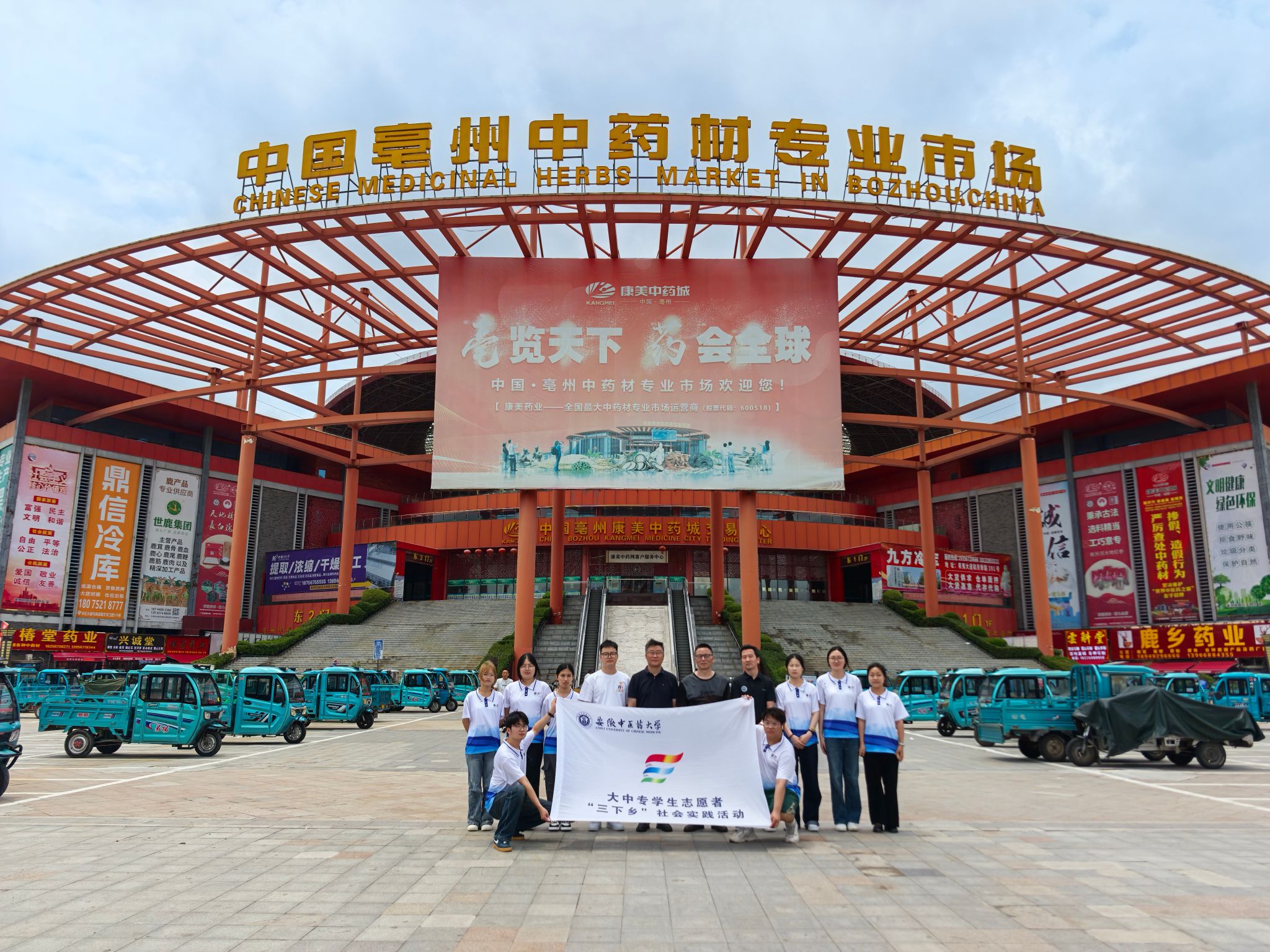 为进一步发挥“行走的思政课”作用,落实立德树人根本任务,强化人才培养质量。6月27-28日,安徽中医药大学"创漾青春"社会实践团队在医药经济管理学院党委书记冯鑫带领下赴亳州市开展了暑期“三下乡”系列活动。活动围绕中医服务、文化宣讲、产业调研、红色教育等主题开展。学院党委委员周慧恩、科研中心主任叶六奇、教工第二党支部支委王郑以及来自学院各年级不同专业的9名学生参加本次活动。
