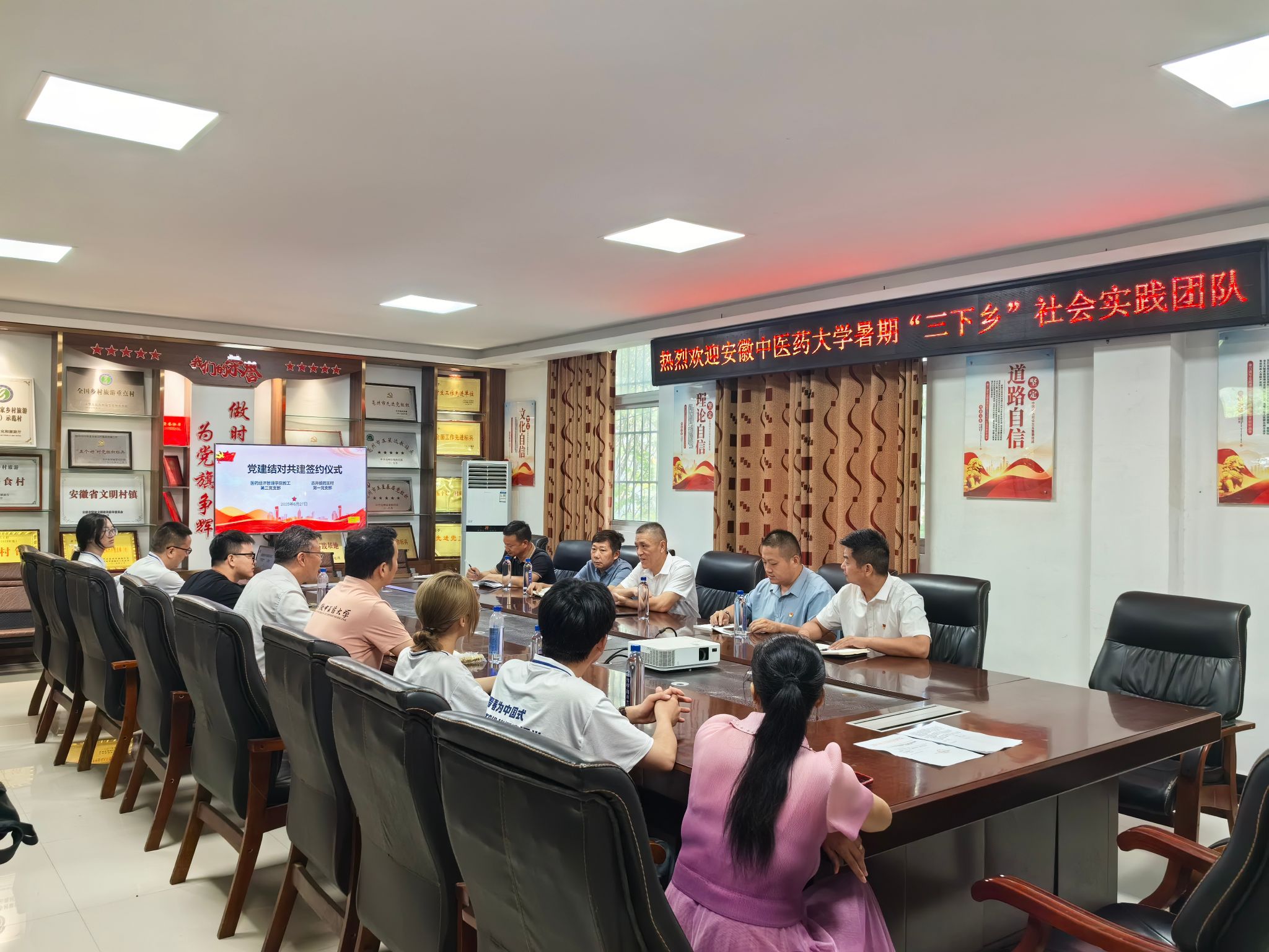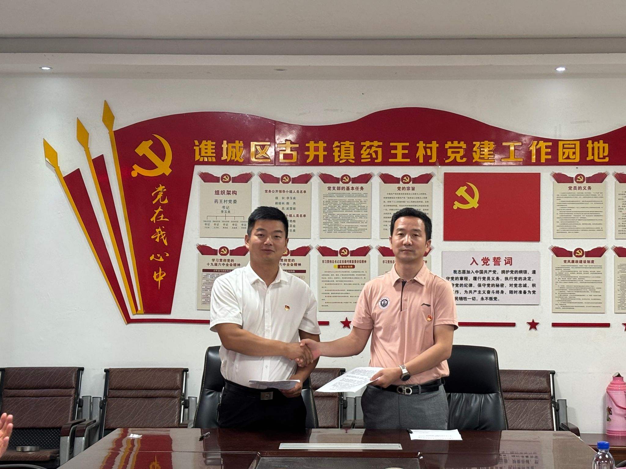 团队抵达药王村后,谯城区古井镇党委书记史伟、副书记锁景荟、药王村第一书记刘睿等热情接待了本次“三下乡”团队。为推动深入贯彻中央八项规定精神学习教育走深走实,进一步密切校地合作,冯鑫为药王村党员干部作了题为《筑牢作风基石 激荡清风正气—深入贯彻中央八项规定精神》专题党课,学院教工第二党支部与药王村第一党支部签署了党建结对共建协议。