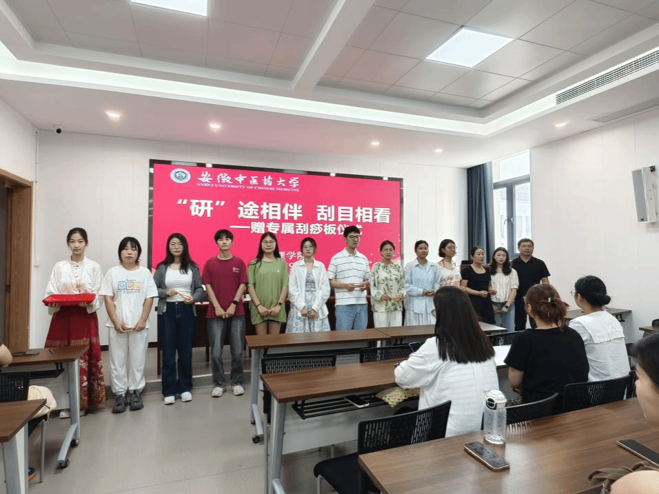 典礼还设置了一个充满创意与温情的环节:“‘研’途相伴,刮目相看”——专属刮痧板赠礼仪式。学院领导们向每一位新生赠送了一份精心定制的、刻有学生姓名的专属刮痧板。这份独具中医护理特色的礼物,不仅寓意着学院对中医药传统文化的传承与发扬,更寄托了对新生们的美好祝愿:愿他们在未来的“研”途上,刮去浮躁,刮去病痛,磨练心性,潜心向学,最终能让师长、让社会“刮目相看”。小小的刮痧板承载着深厚的关怀,令新生们倍感惊喜与温暖。