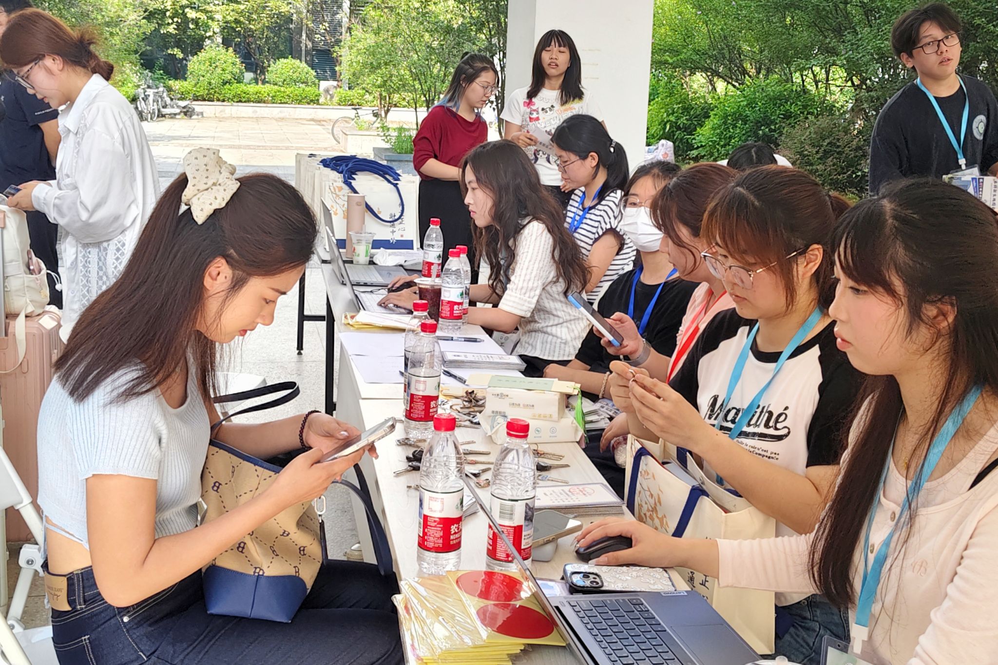 党员先锋岗的党员和忙碌的志愿者们为新生和家长们,搬运行李、答疑解惑。袅袅兮秋风,吹不散志愿者和老师们的热情,一张张笑脸,盼望着新同学的到来。学院还为2025级新生们贴心准备了暖心资料袋——印有学院专属IP的定制款资料袋、学院简介手册、定制小风扇、定制卡套,以及防电诈宣传彩页,装满了学院领导老师和新生辅导员的贴心关怀。