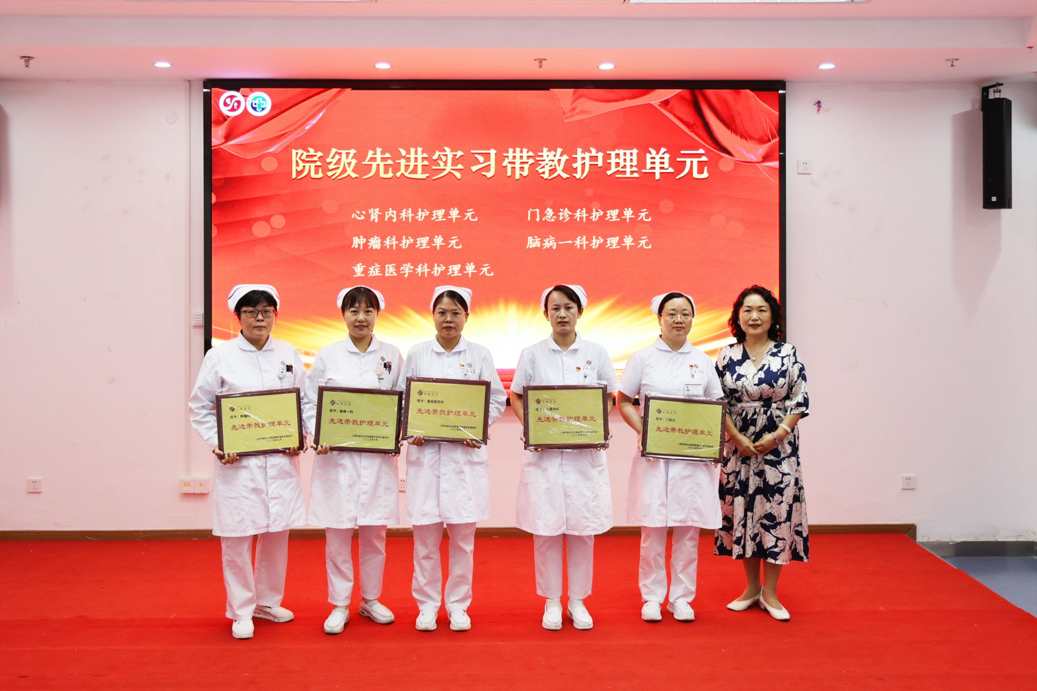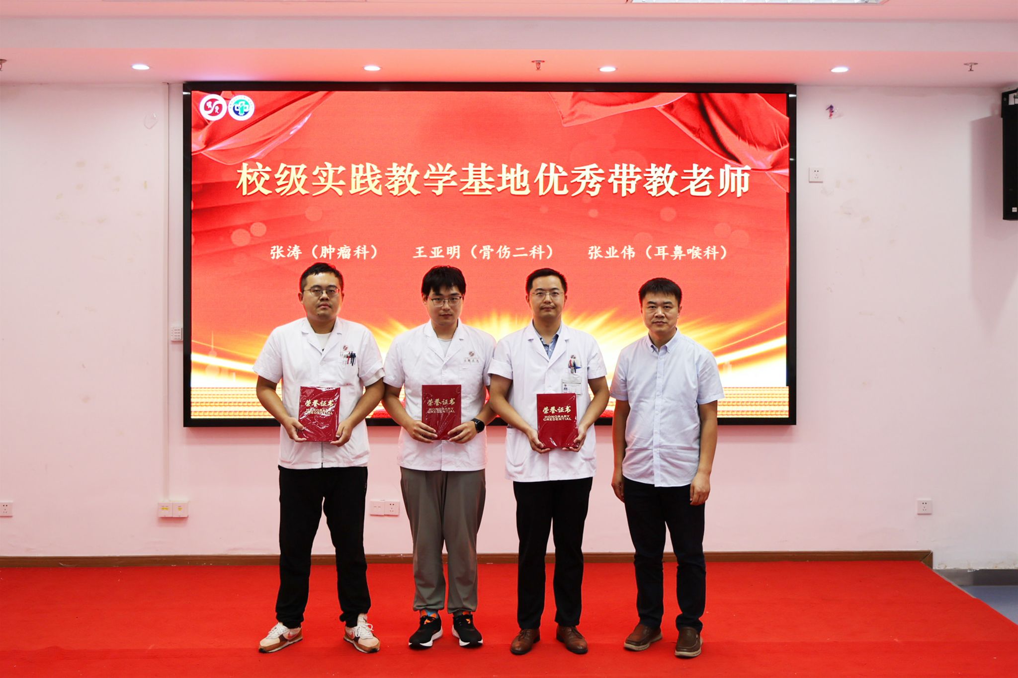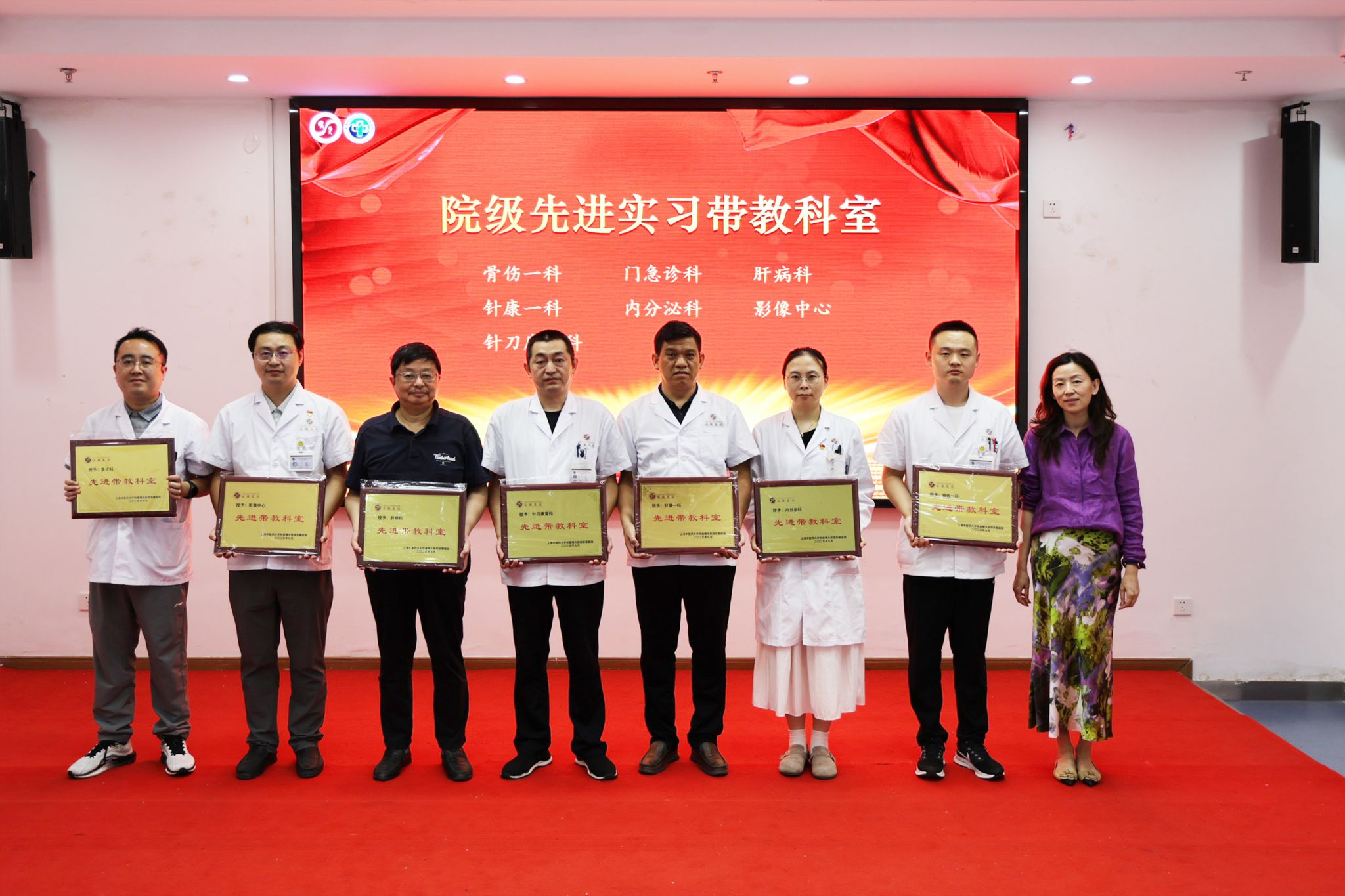 大会对在临床教学工作中表现突出的先进个人与集体进行了表彰。栾国瑞等15名教师获院级“优秀实习带教老师”,门急诊护理单元等5个集体获院级“先进实习教学护理单元”,肝病科等7个科室获院级“先进实习教学科室”;王亚明等3名教师获校级“实践教学基地优秀带教老师”,普外科与脑病二科获校级“实践教学基地先进科室”。与会领导分别为获奖代表颁奖授牌,现场掌声不断。