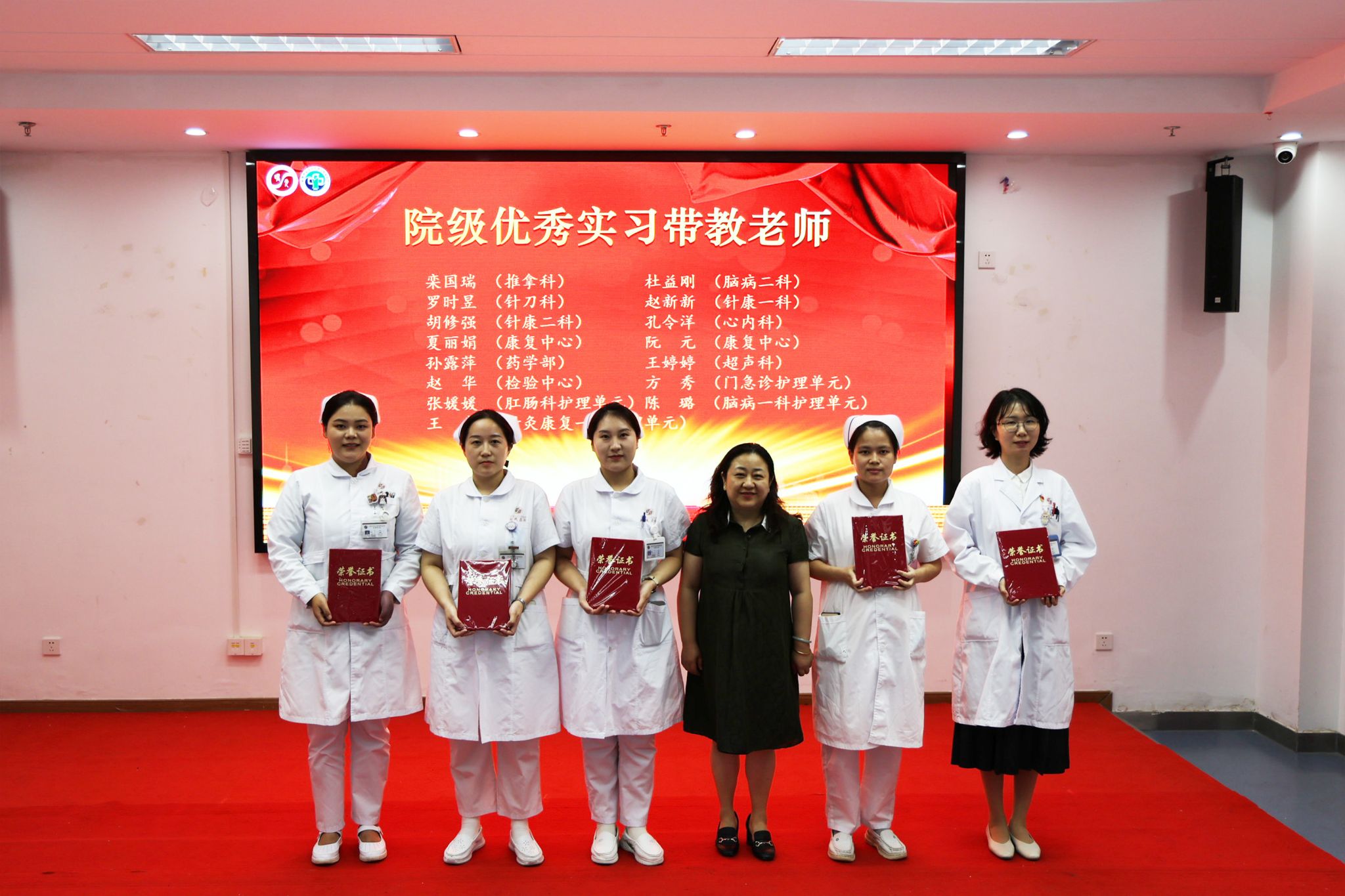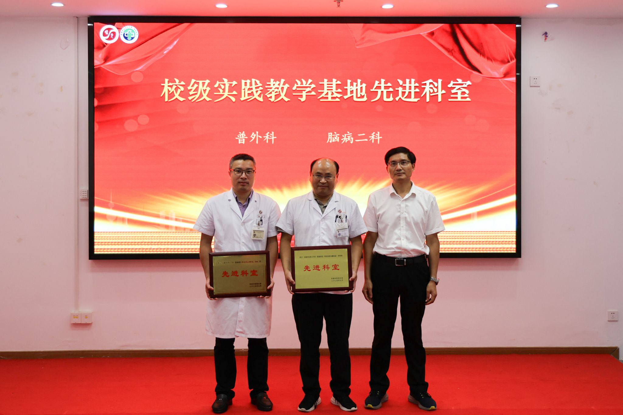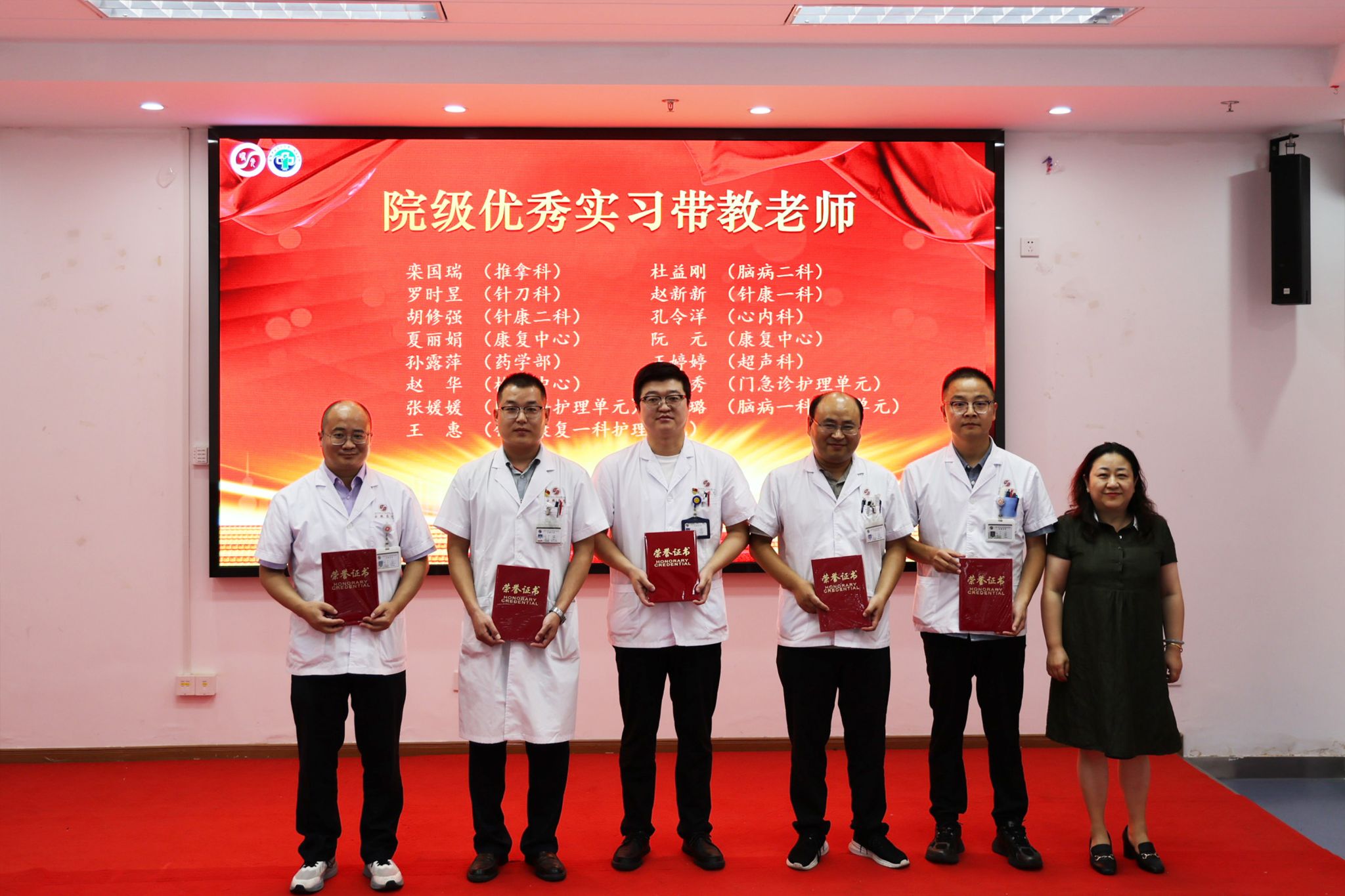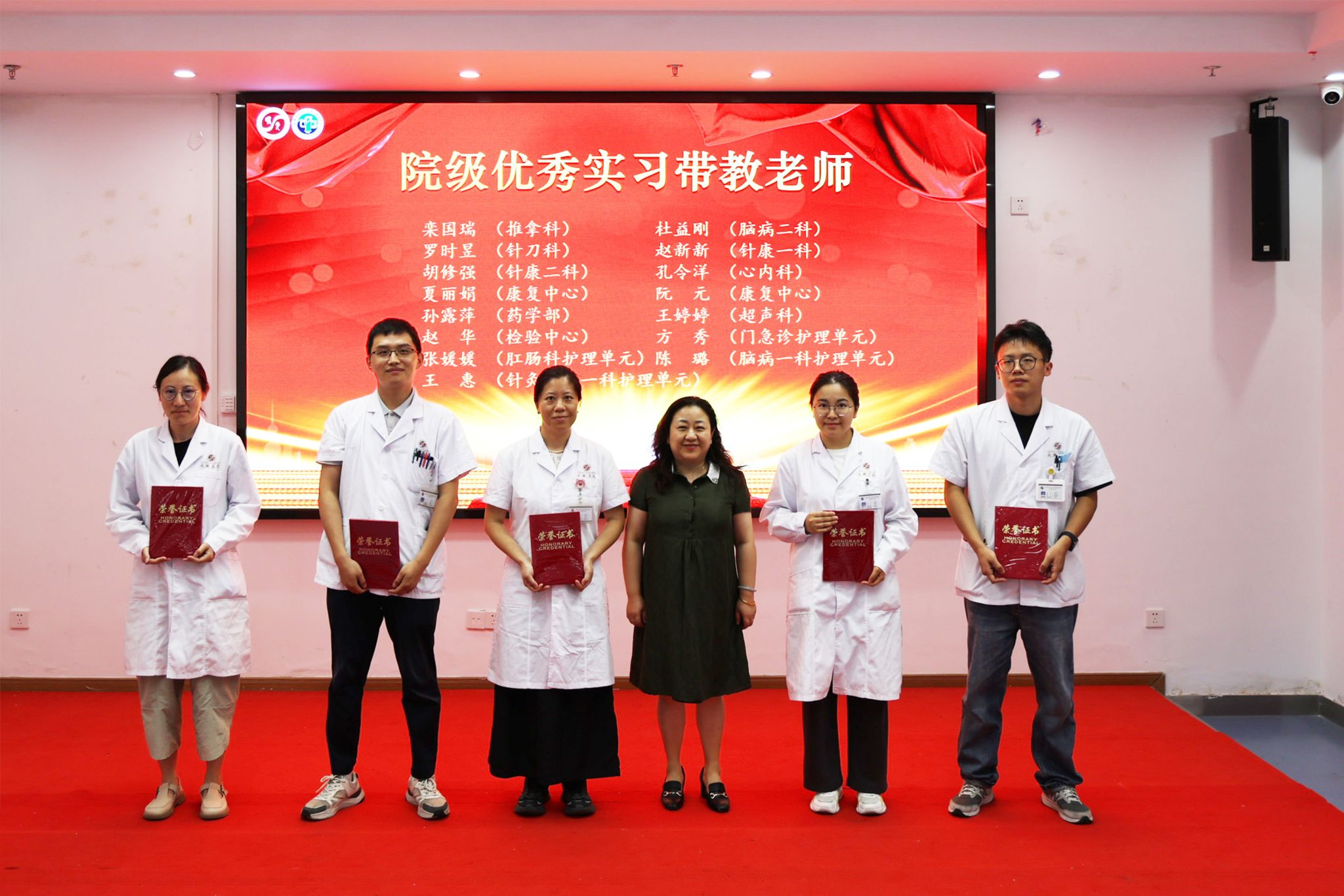 大会对在临床教学工作中表现突出的先进个人与集体进行了表彰。栾国瑞等15名教师获院级“优秀实习带教老师”,门急诊护理单元等5个集体获院级“先进实习教学护理单元”,肝病科等7个科室获院级“先进实习教学科室”;王亚明等3名教师获校级“实践教学基地优秀带教老师”,普外科与脑病二科获校级“实践教学基地先进科室”。与会领导分别为获奖代表颁奖授牌,现场掌声不断。