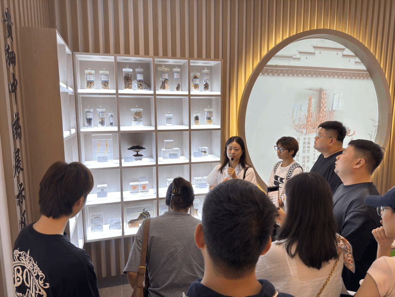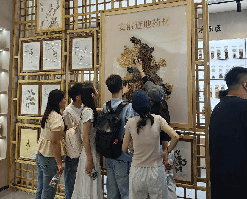 活动现场,同学们首先来到了中药标本馆。跟随研究院讲解员的脚步,了解了安徽丰富的中药资源。从“南新安,北华佗”的中医文化传承,到省内不同区域的特色中药材,结合超高精数字化药材模型系统,同学们对于安徽省道地药材有了更为深入的了解。随后,走进安徽地产药材展示区。霍山石斛、黄精、天麻等 15 味中药材标本映入眼帘,中药标本在灯光下的展示盒中熠熠生辉,凸显精致。