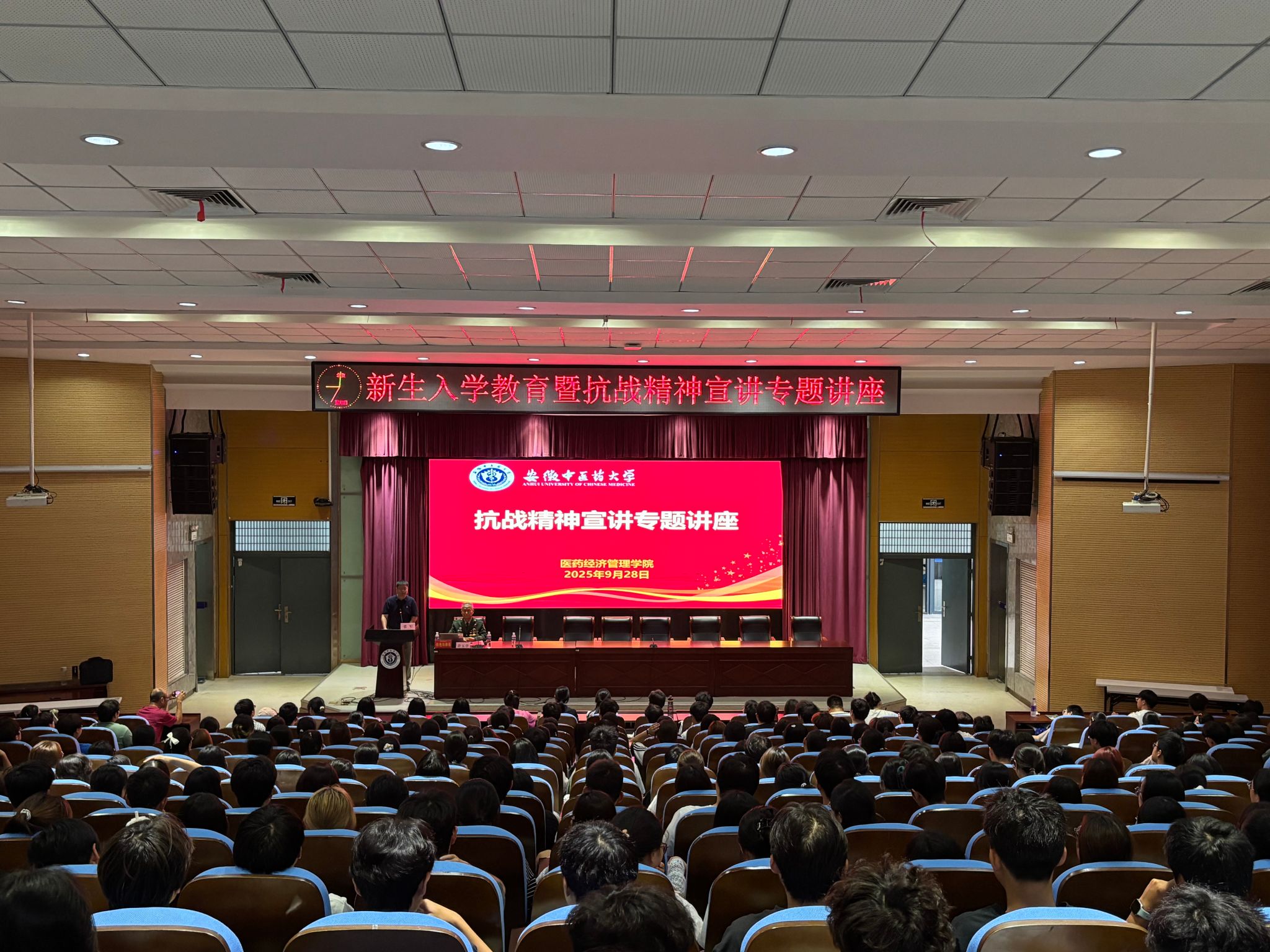 9月28日上午,医药经济管理学院举行2025级新生入学教育暨 “弘扬伟大抗战精神,为实现强国建设民族复兴伟业而奋斗”专题讲座。学院特邀全国高校“中国共产党人精神谱系”宣讲团成员、全国模范退役军人、全国离退休干部先进个人许玉亭同志担任主讲嘉宾。学院党委书记张军主持宣讲,2025级全体新生及新生辅导员共同聆听了这场深刻而富有教育意义的报告。