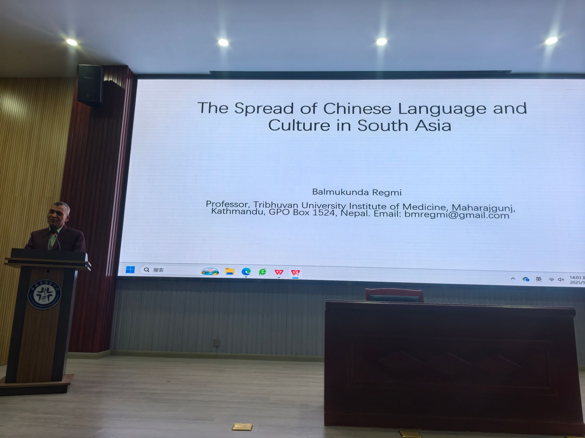 本次论坛特邀尼泊尔学术界及中尼关系领域重要人物、尼泊尔特里布文大学医学院教授、尼中社会关系研究院院长雷格米担任主讲嘉宾,围绕“汉语及中华文化在南亚的传播”主题展开深度分享。人文与国际教育交流学院副院长昂文平主持并致辞。