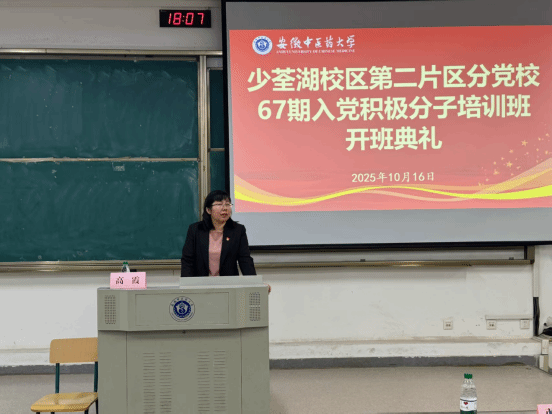 10月16日,安徽中医药大学少荃湖校区第二片区分党校第67期入党积极分子暨青马工程培训班顺利开班,医药信息工程学院党委书记高霞、第一临床医学院党委副书记宋婷婷,医药信息工程学院、第一临床医学院学生党支部书记以及本期155名学员参加开班典礼。高霞作动员讲话,宋婷婷主持典礼。