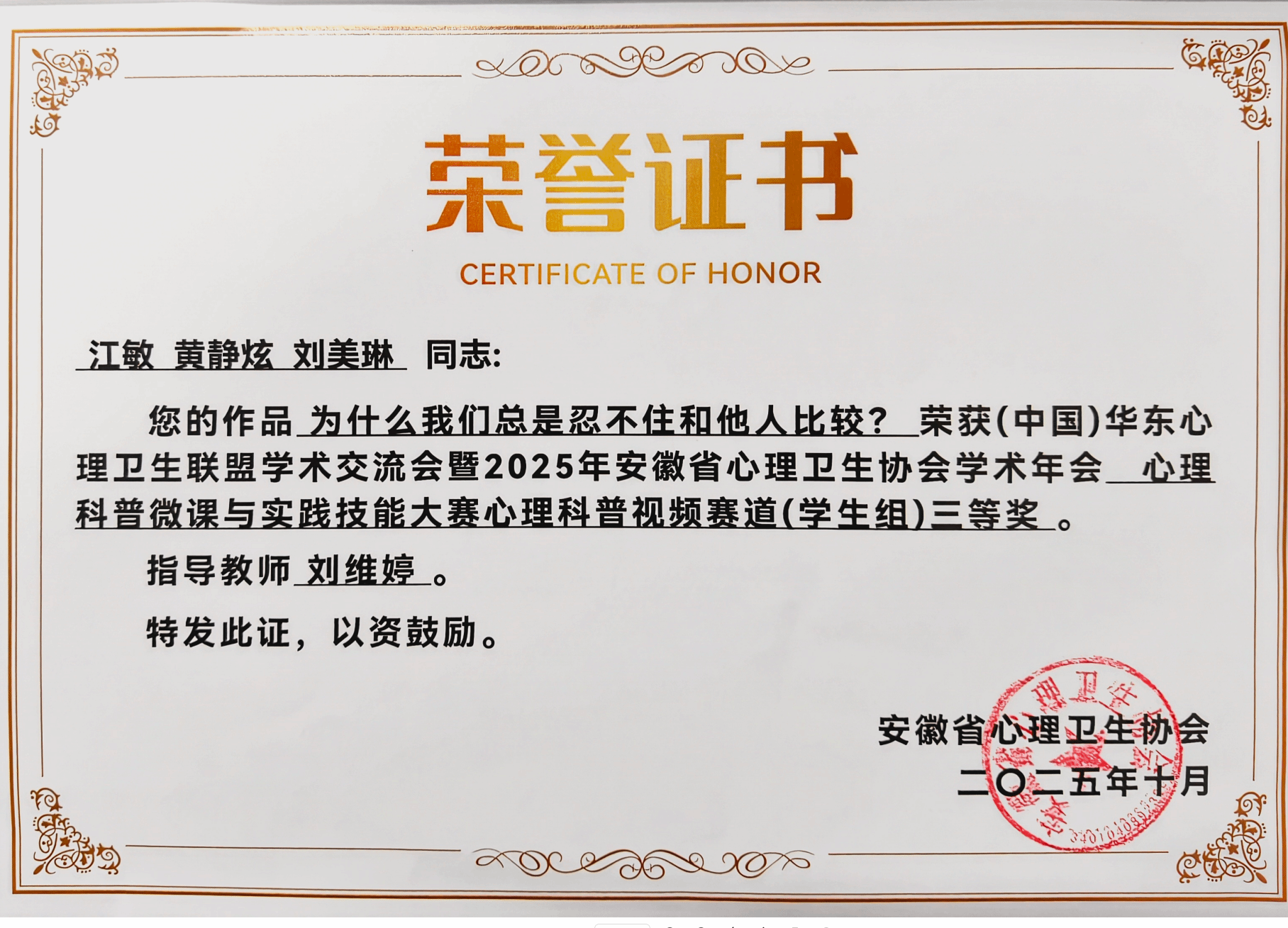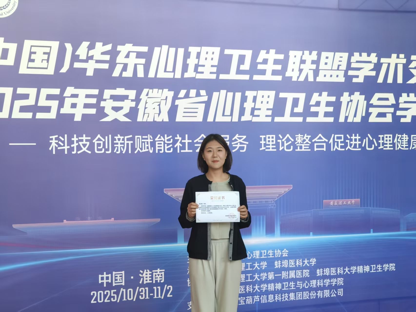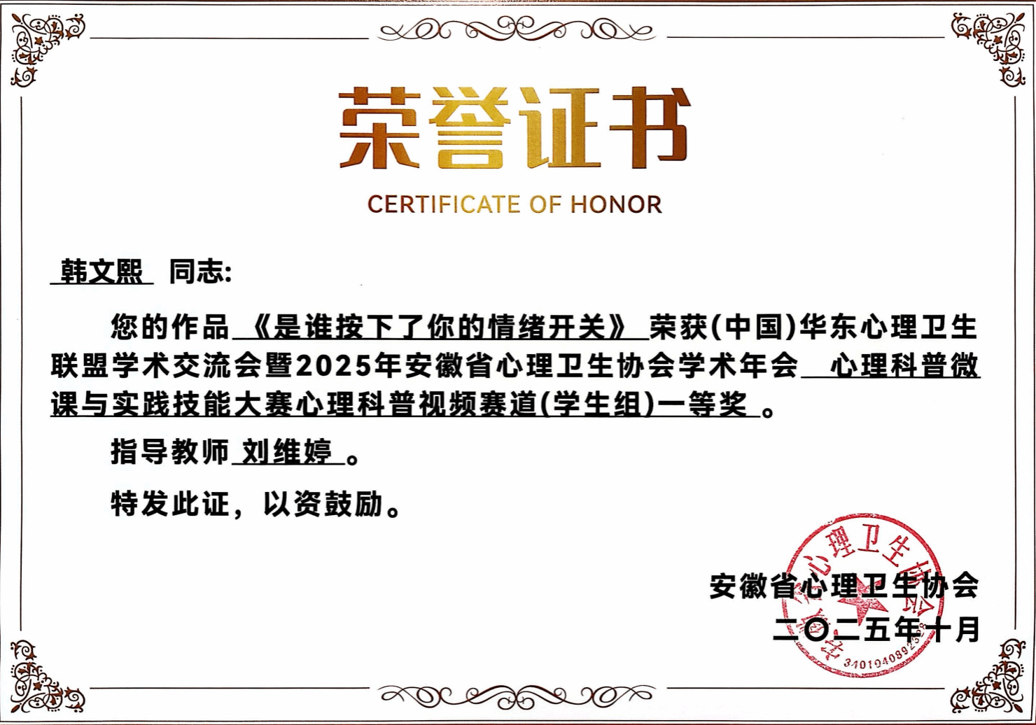近日,(中国)华东心理卫生联盟学术交流会暨2025年安徽省心理卫生协会学术年会圆满落幕,在同期举办的心理科普微课与实践技能大赛中,我校参赛学生护理学院研究生韩文熙、本科生江敏表现优异,分别获心理科普视频赛道(学生组)一等奖、三等奖。