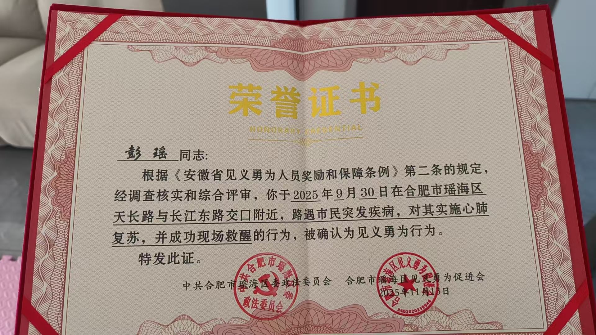 11月14日下午,瑶海区召开见义勇为先进个人表彰会,授予我校第二附属医院主管护师彭瑶“瑶海区见义勇为先进个人”荣誉称号,表彰其在危急关头挺身而出,成功挽救一名心脏骤停居民的英勇事迹。