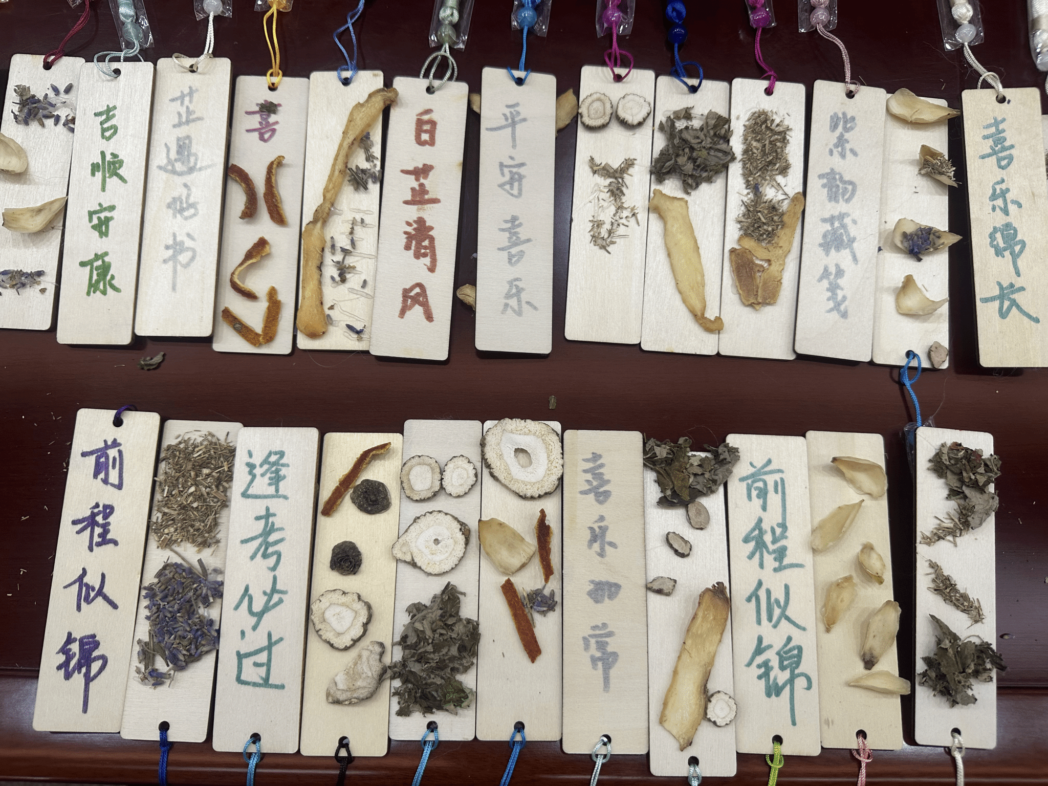 活动将劳动教育与中医药文化创新实践深度融合。本草书签以薰衣草、菊花等道地药材为原料,经热熔胶定格自然之美;艾草锤选用三年陈艾搭配其他药材,手工制作出兼具实用性与观赏性的养生工具;足浴包将当归、生姜等药材科学配比,制作出驱寒祛湿、舒缓疲劳等不同类型足浴包;中药香薰用天然中药香材与蜂蜡制作可悬挂的香薰蜡片,散发淡雅药香,装饰空间同时发挥养生作用。每一件作品均标注药材功效与使用说明,既承载劳动汗水,亦传递中医药智慧。